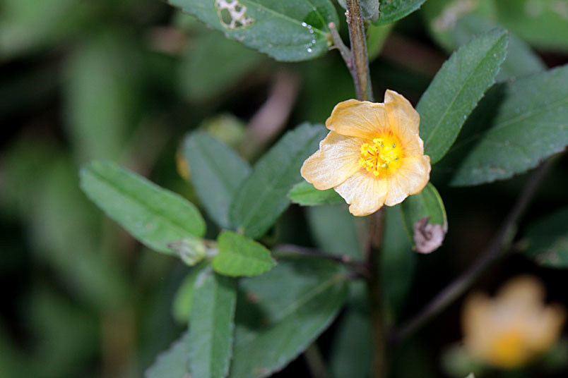 花單生,腋生,黃色,略有毛茸,有關節;花萼鐘形,先端銳尖