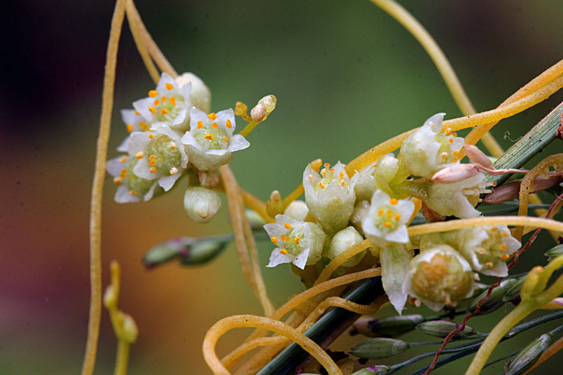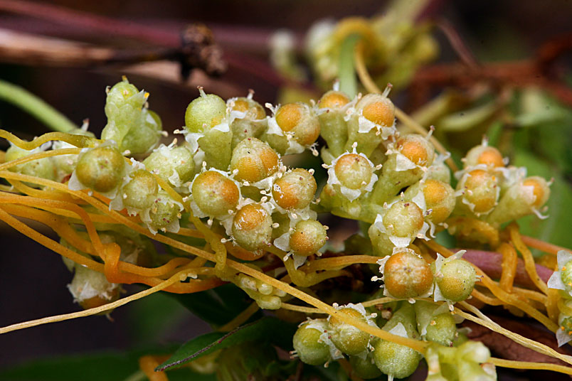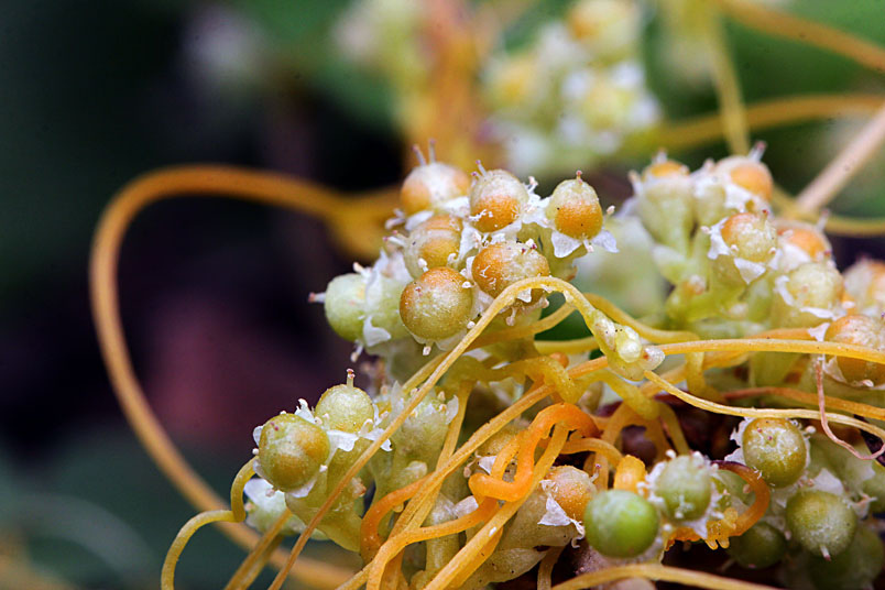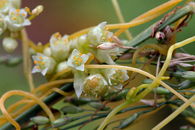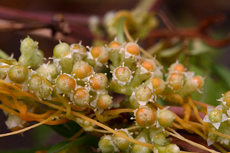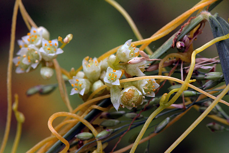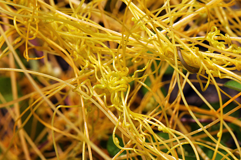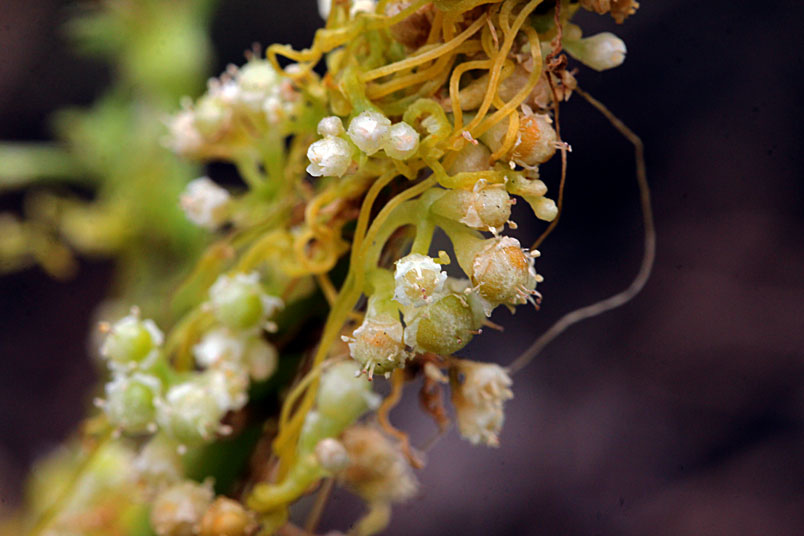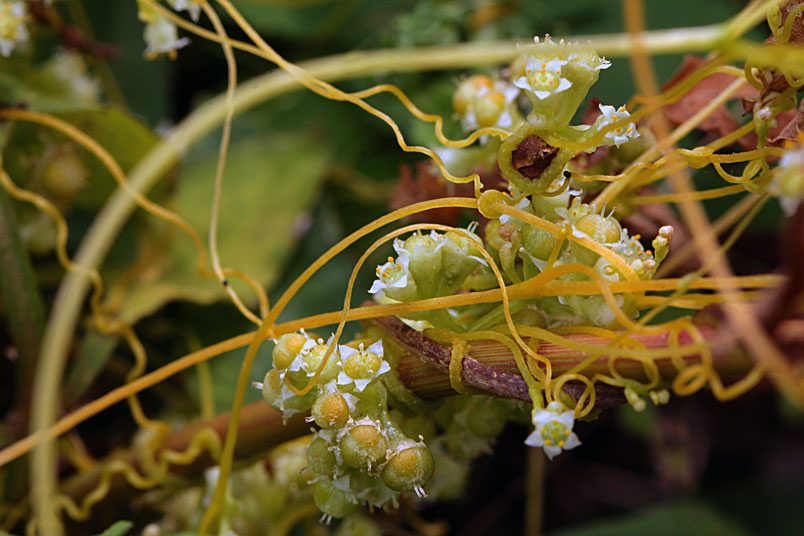 黃色,細長莖以左旋纏繞方式攀纏糾住寄主,被寄生的植物則往