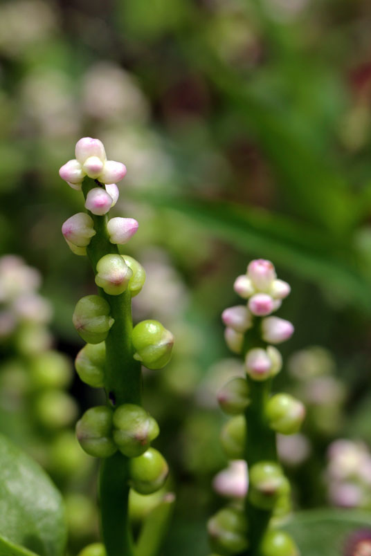成株後在夏秋之際自葉腋長出肉質穗狀花序,花為黃白至紫紅色