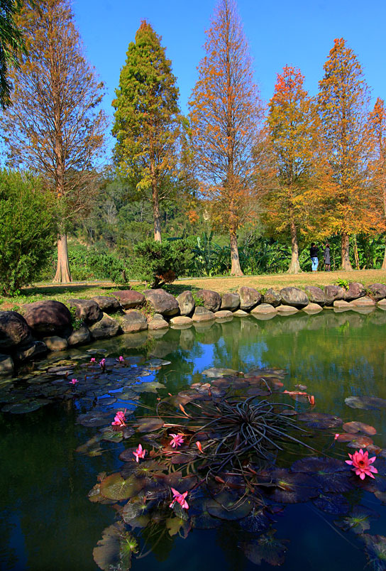 ,水塘邊有十七棵落羽松,冬季隨著氣溫變色後,葉子黃紅交錯