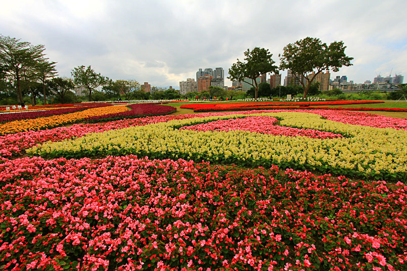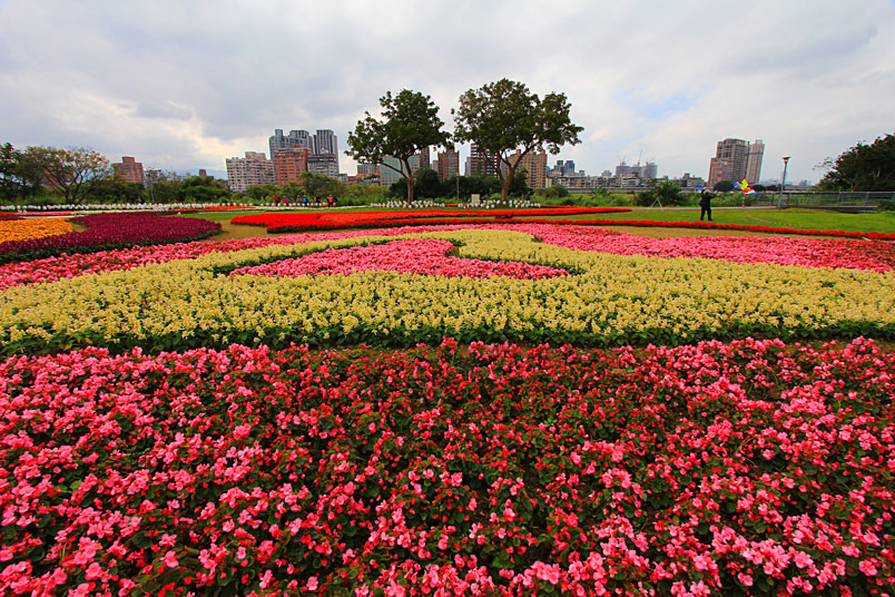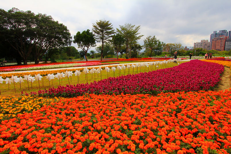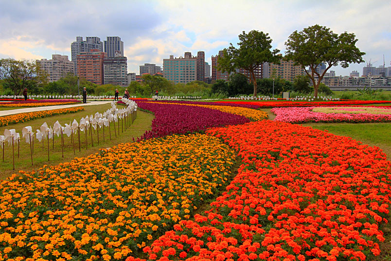 古亭河濱公園跨堤平台下方,種植大片花海,以孔雀草、一串