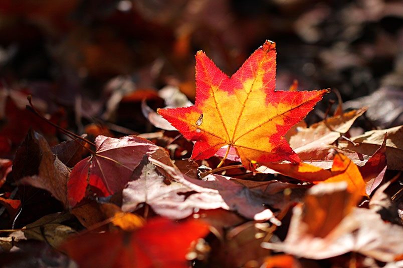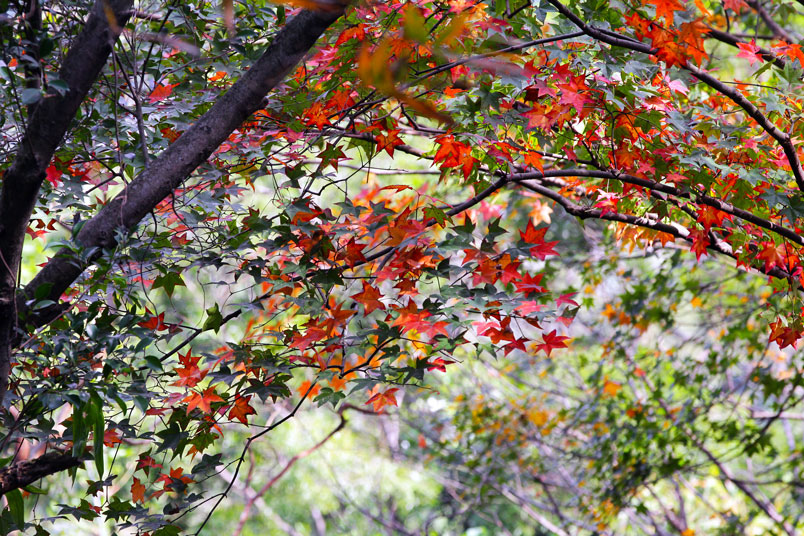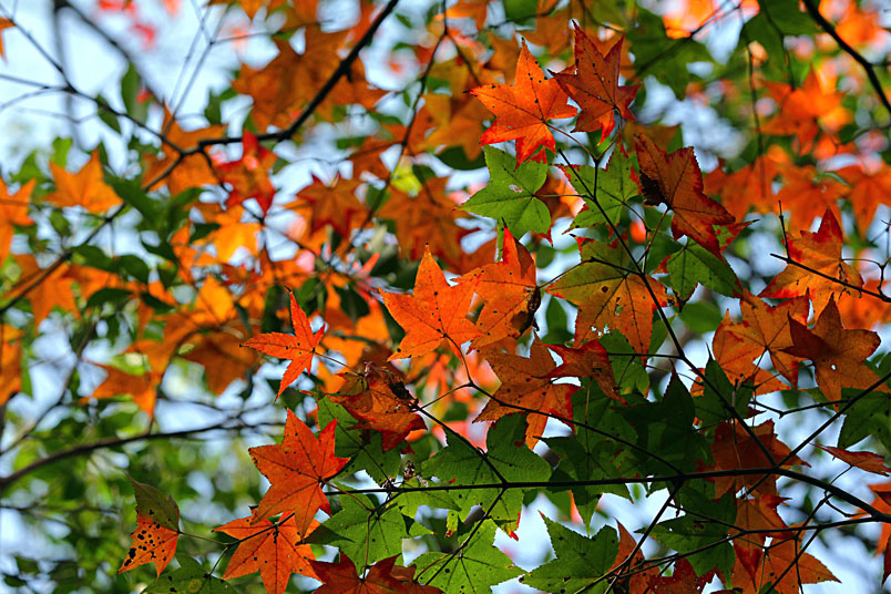 翠綠、橙黃、赭紅五彩斑斕的楓葉,在冬陽暖暖的照耀下,透光