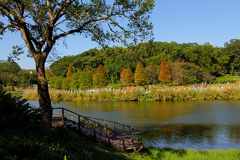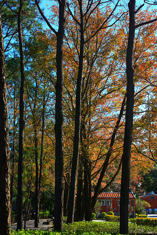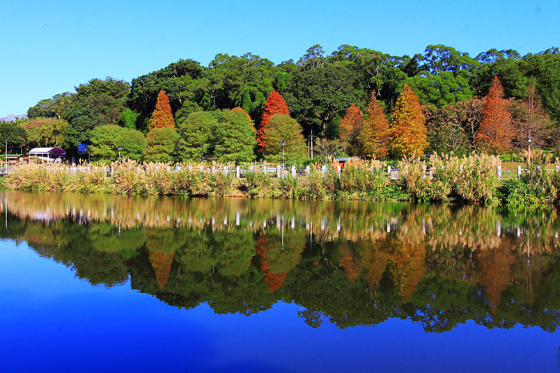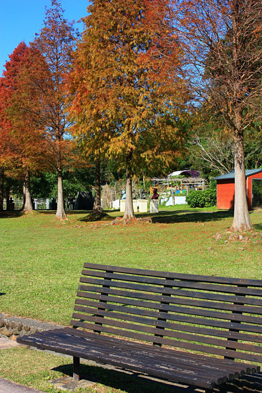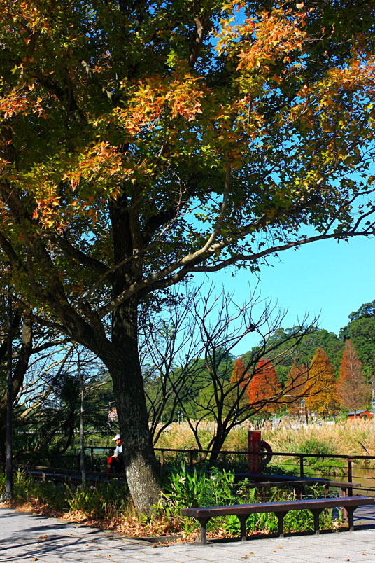 雕塑公園銅像區旁的落羽松也不惶多讓,紛紛換上彩衣,也美麗繽