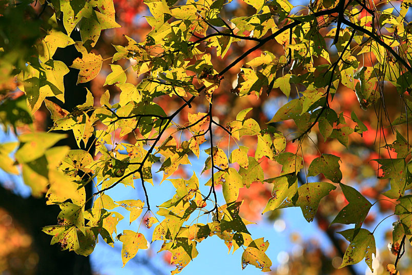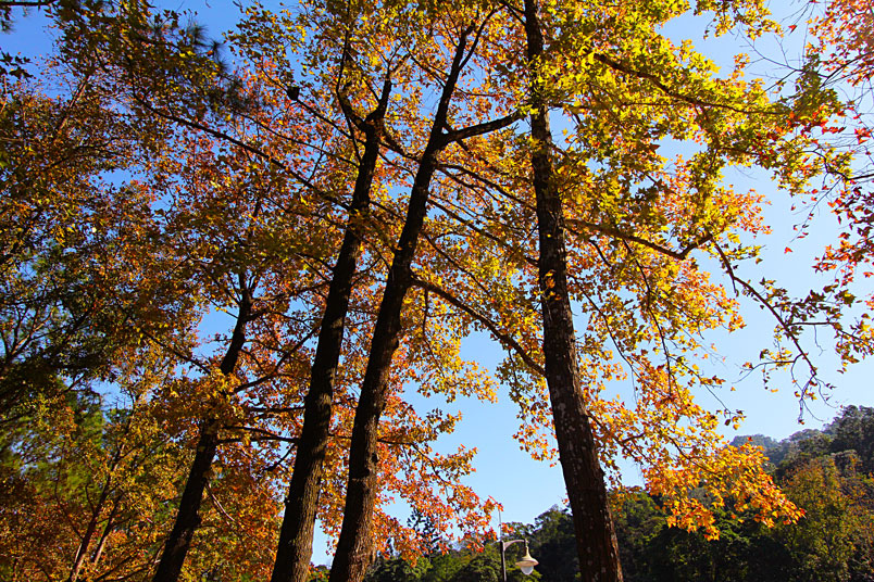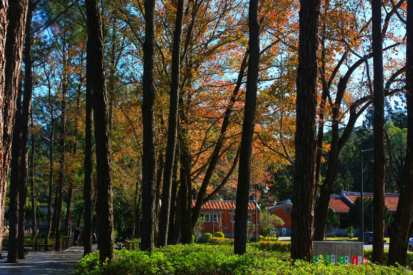 大溪慈湖的落羽松和楓香已進入了變色期。停車場兩旁的楓樹,綠