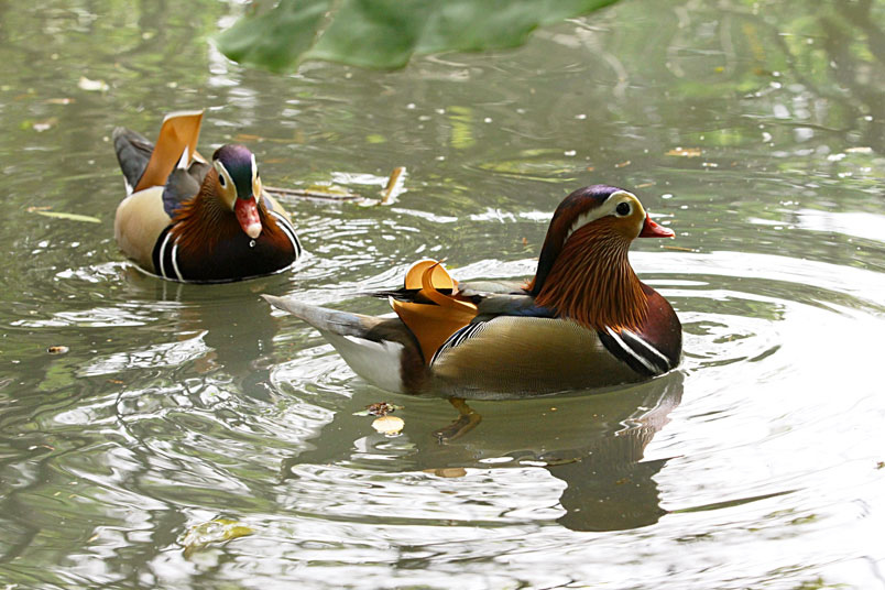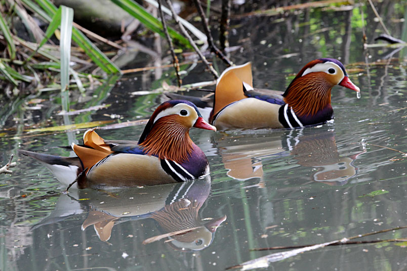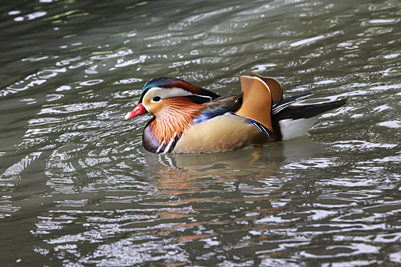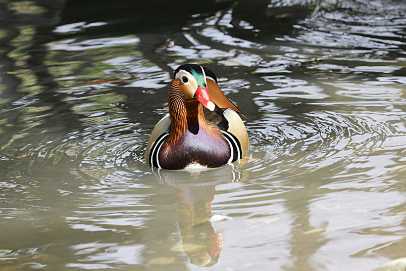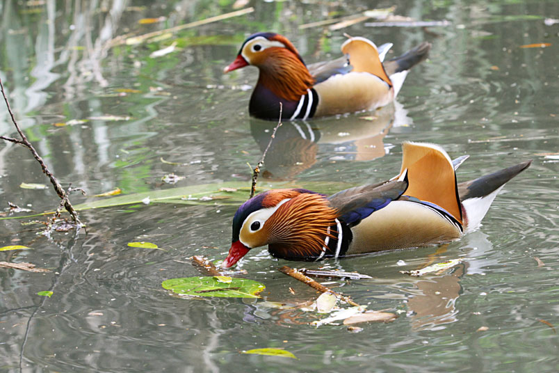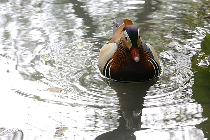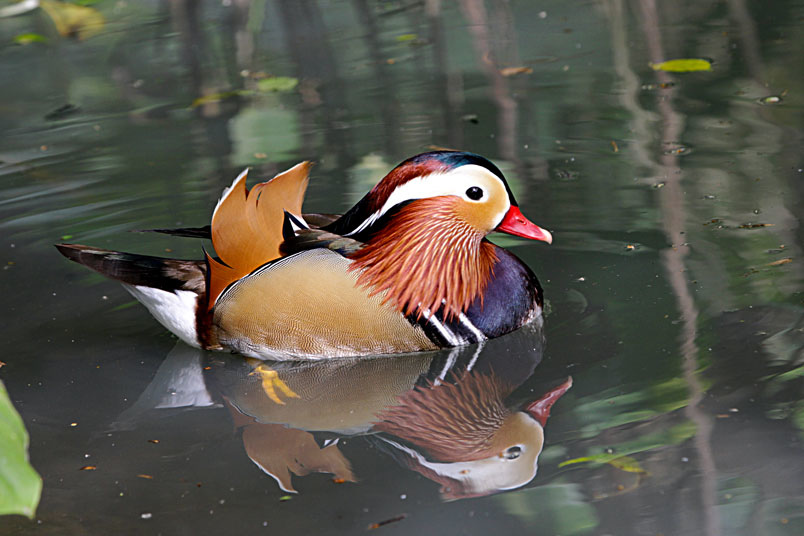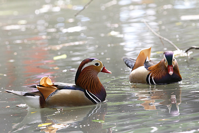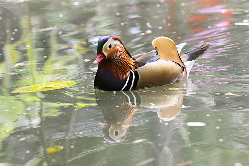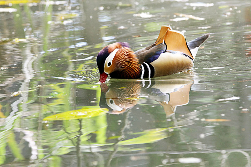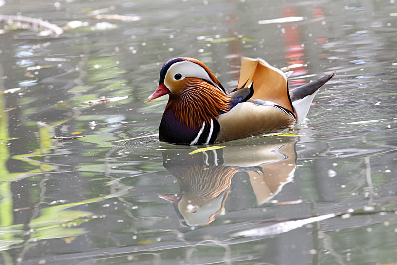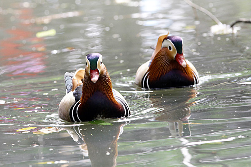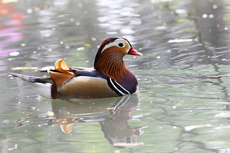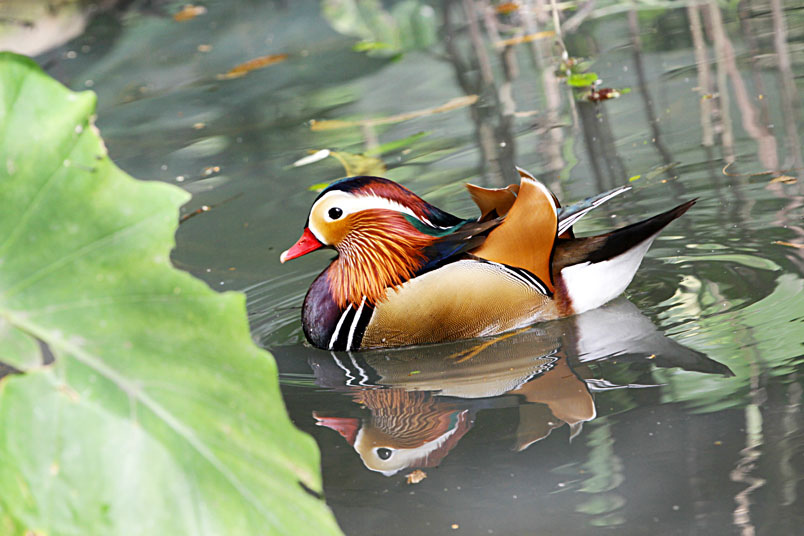 雄性鴛鴦色彩極為艷麗,喙為少見的鮮紅色,端部具亮黃色嘴甲。