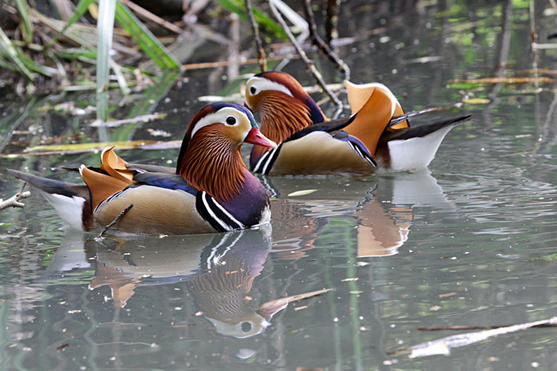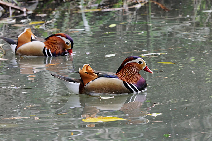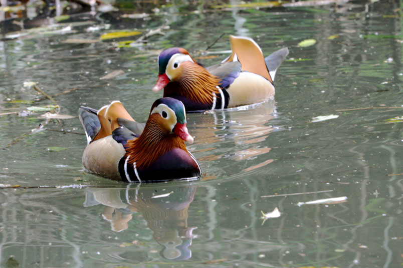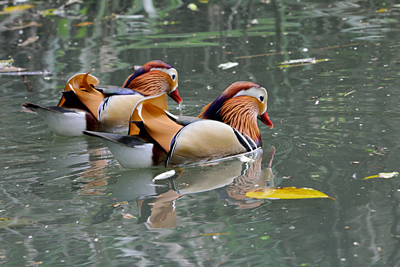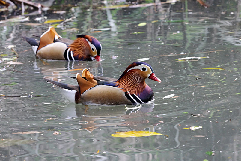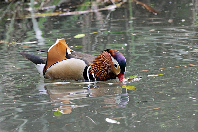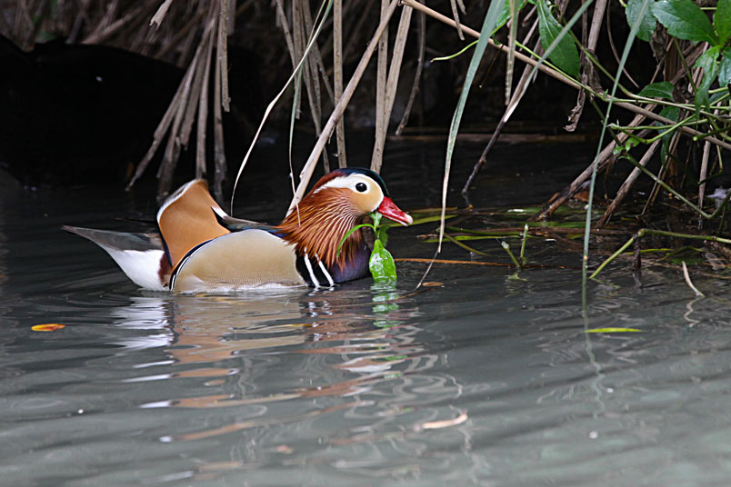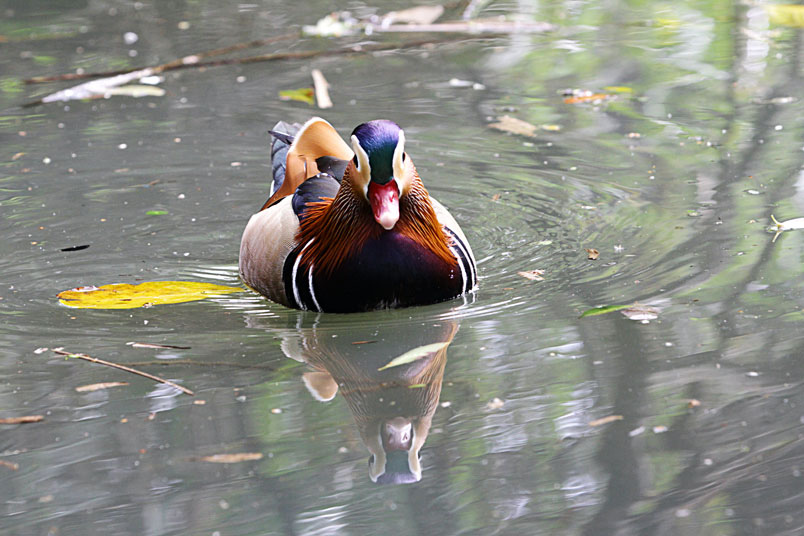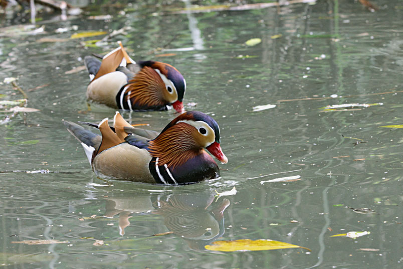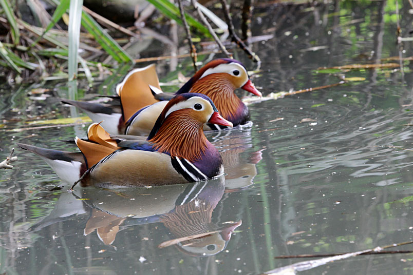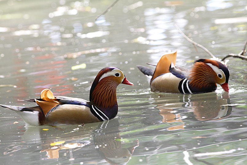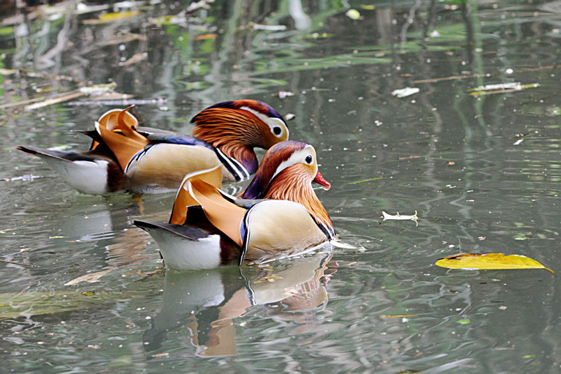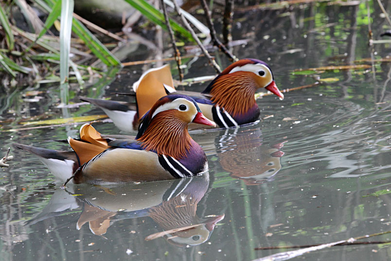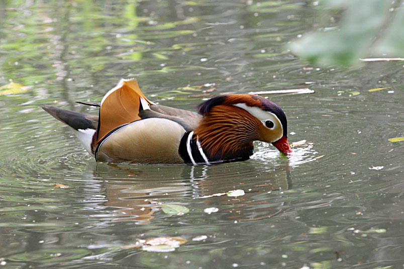 雄性鴛鴦色彩極為艷麗,喙為少見的鮮紅色,端部具亮黃色嘴甲。