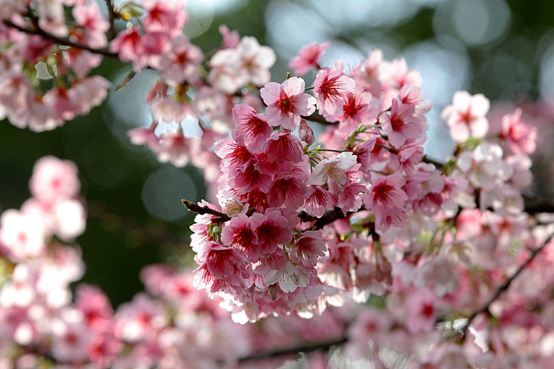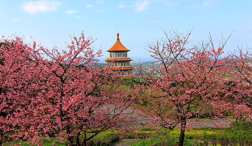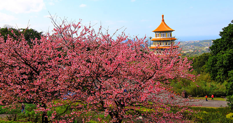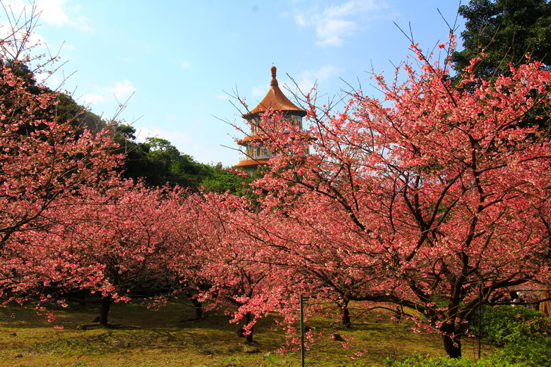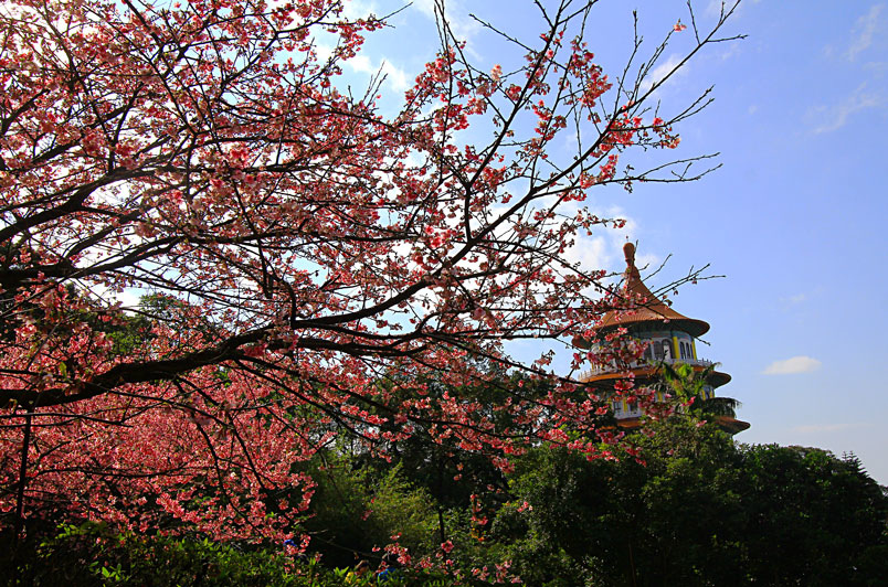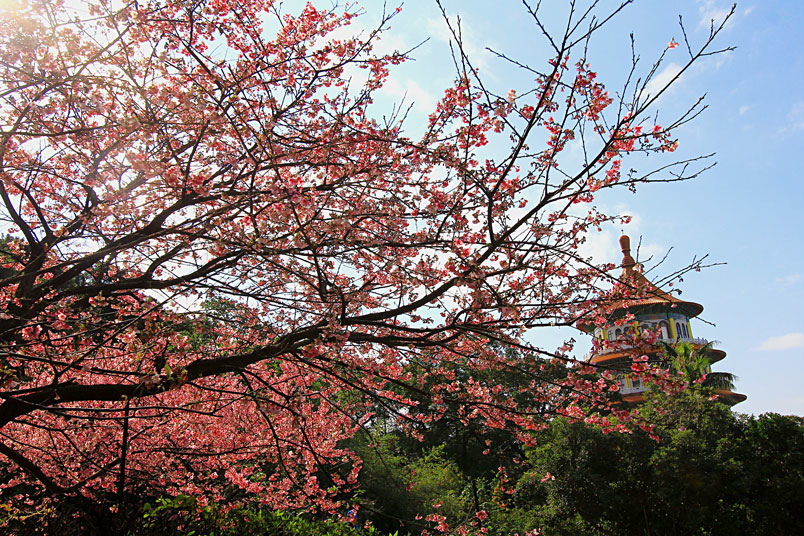 粉白、粉紅和桃紅的層次點綴,三色櫻將天元宮後山妝點得繽紛