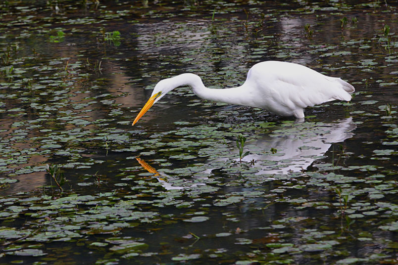 大白鷺覓食時,常會伸長筆直頸部向前斜望,當魚兒游到牠取食