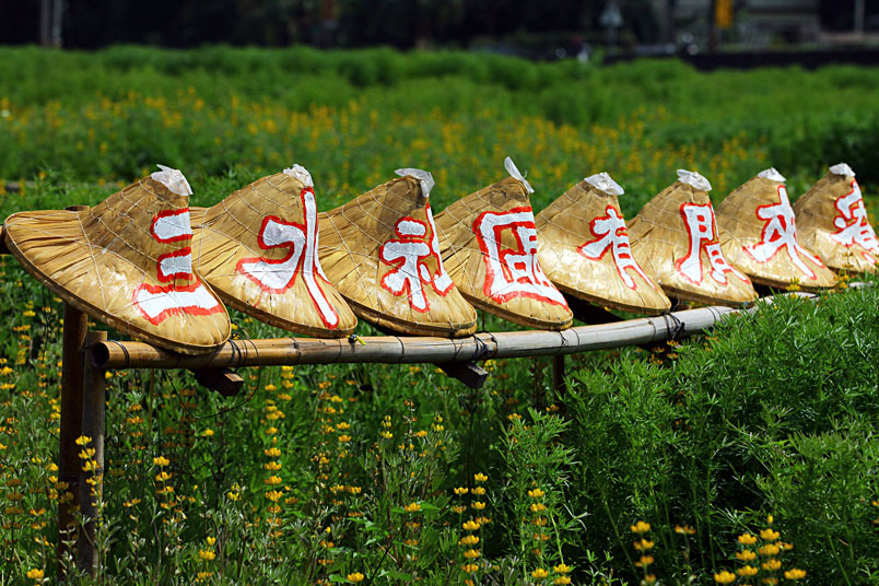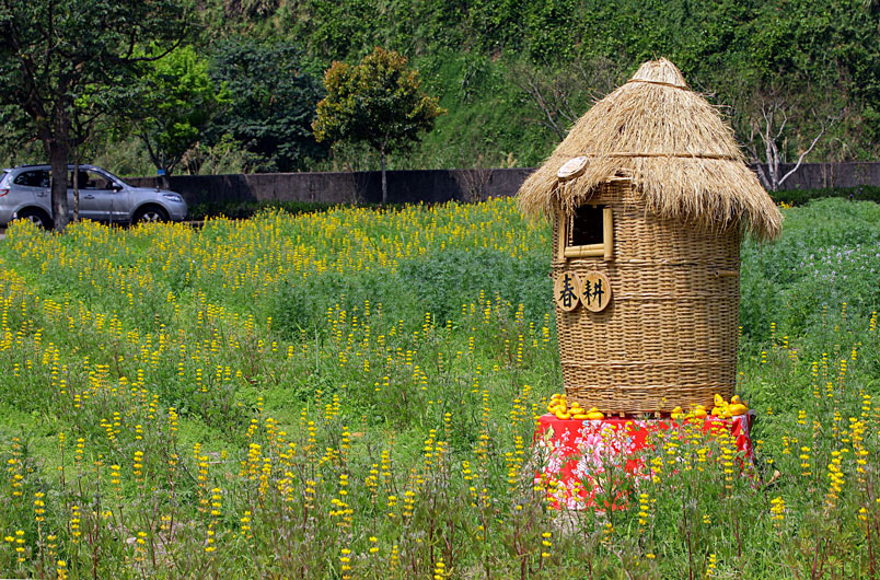 創意花田裡還擺有充滿客家文化特色的裝置藝術,和魯冰花一起入鏡