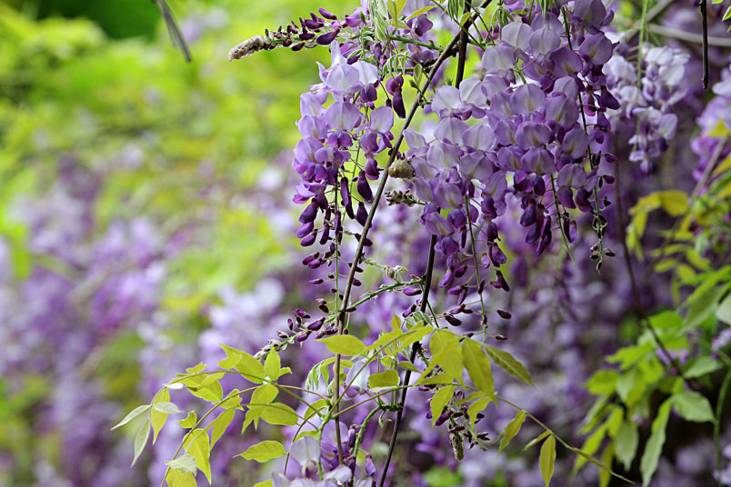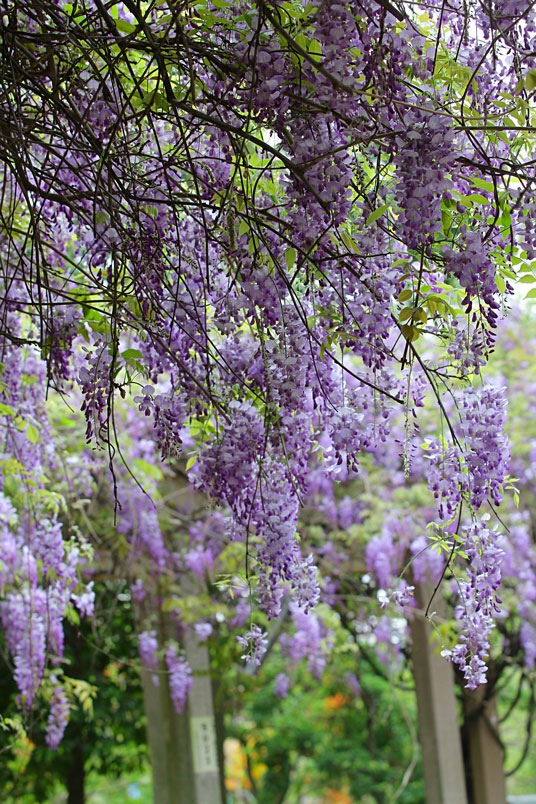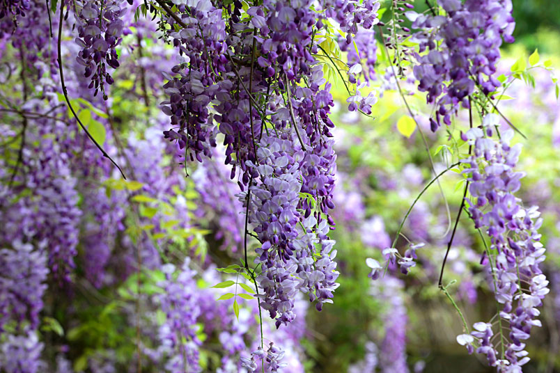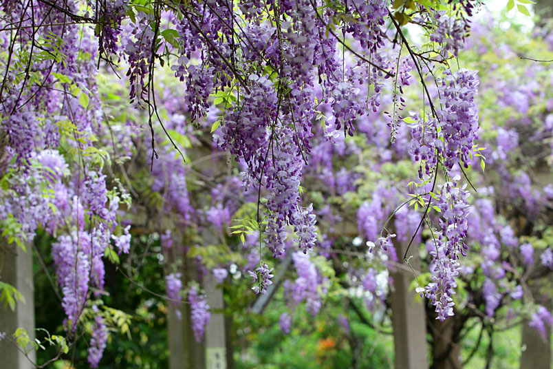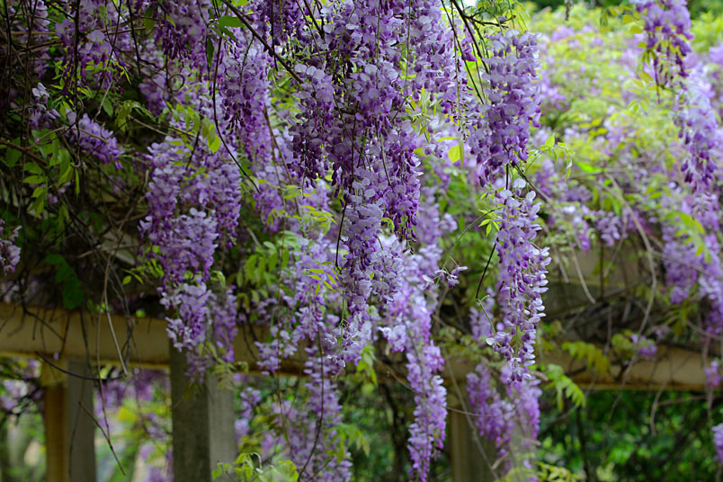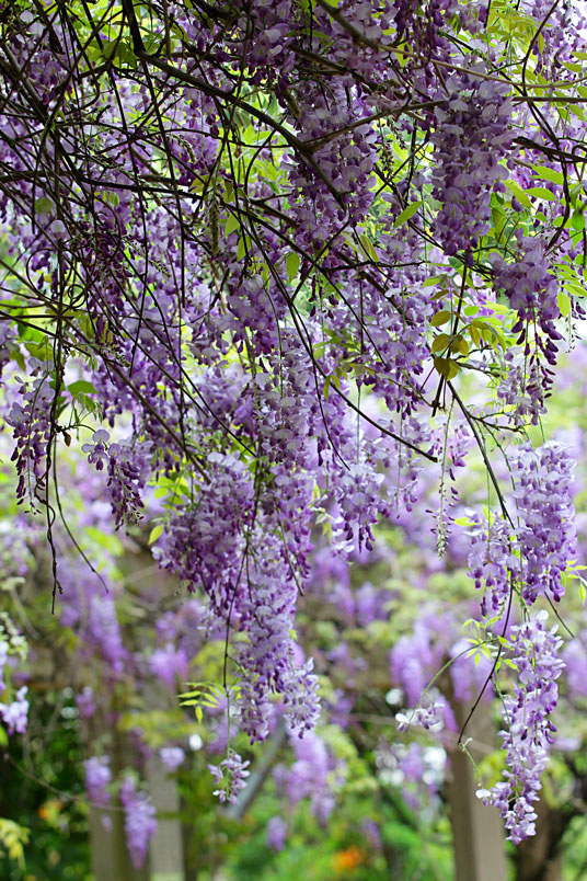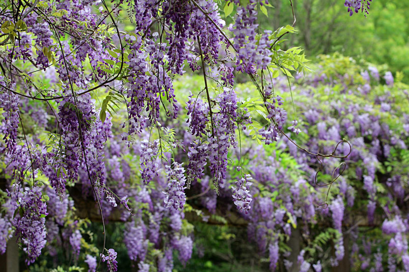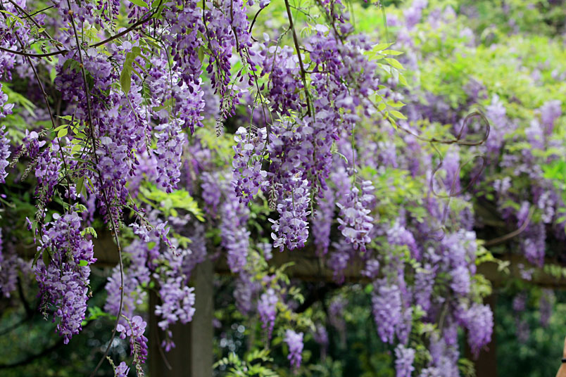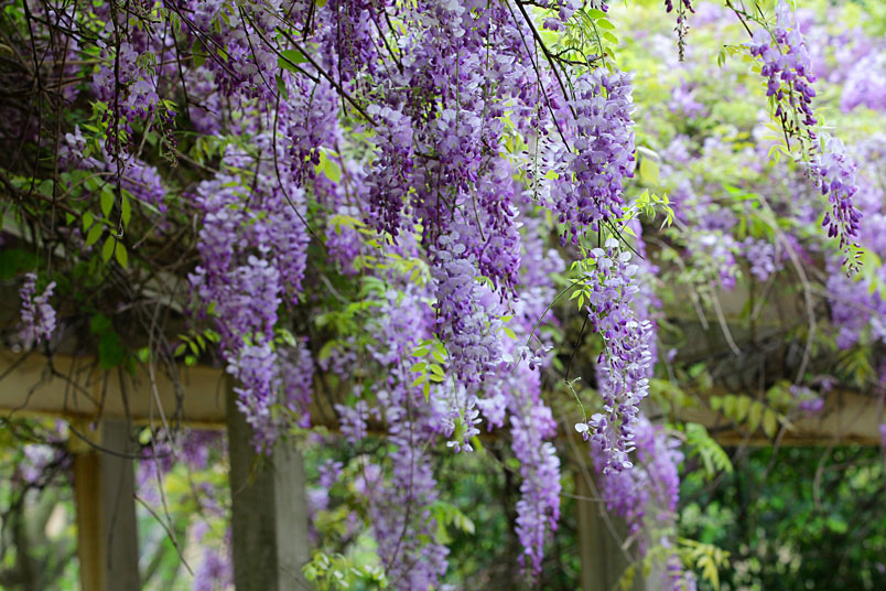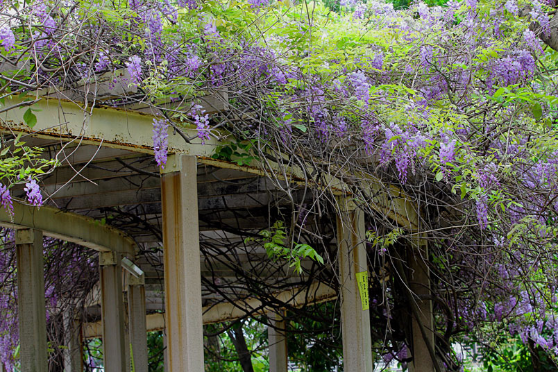 園裡的弧形棚架上,彷彿掛滿一串串紫色風鈴,浪漫的紫色花瀑,