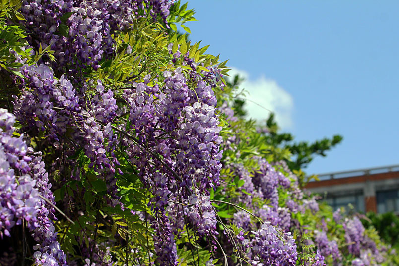 開南大學向陽步道的花架上,紫藤成串垂墜形成美麗花瀑,光豔逸
