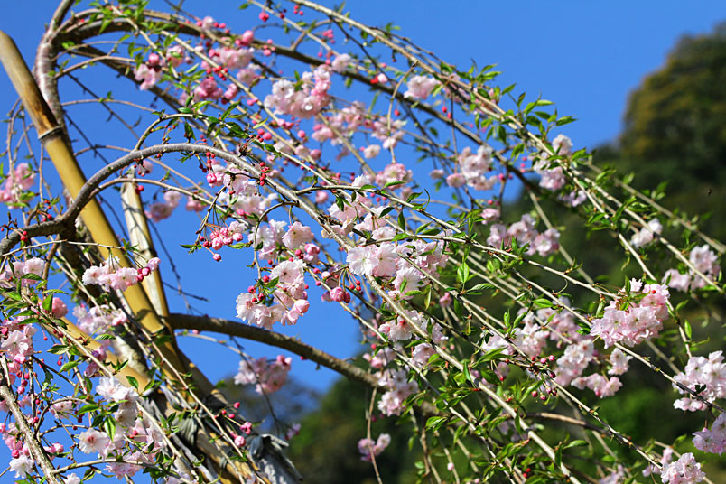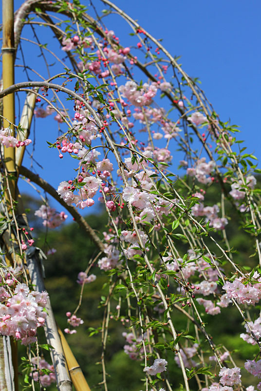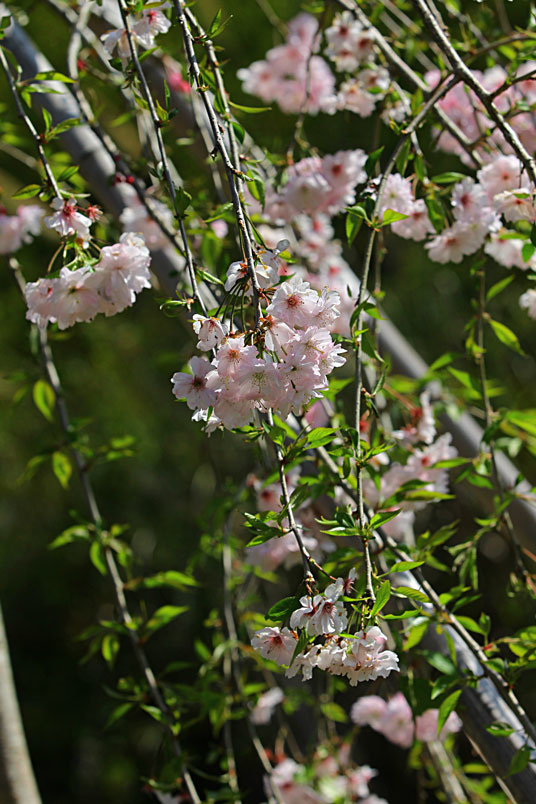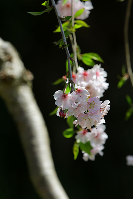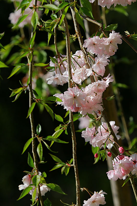蕊非常突出,枝葉自然垂下,垂枝再搭配垂花,綻放於時晴時雨春