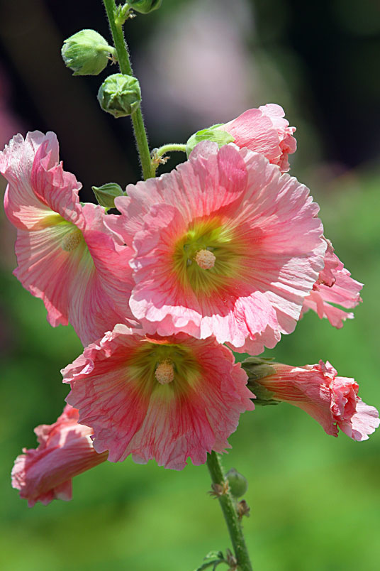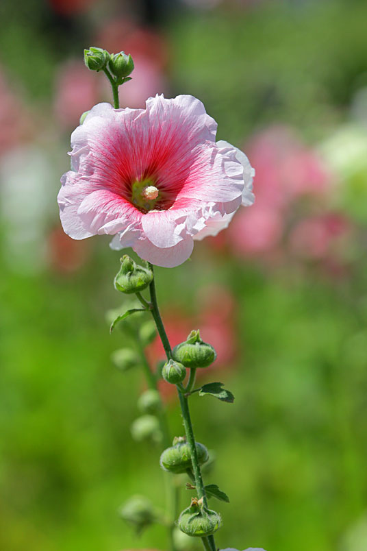 蜀葵像是身穿粉綠長裙,大紅花上衣的妙齡女郎,曼妙的身材,在