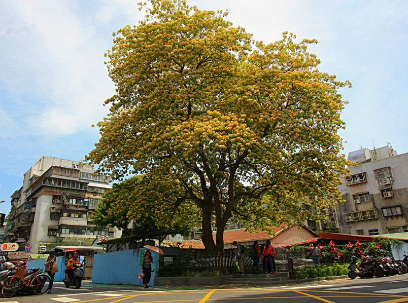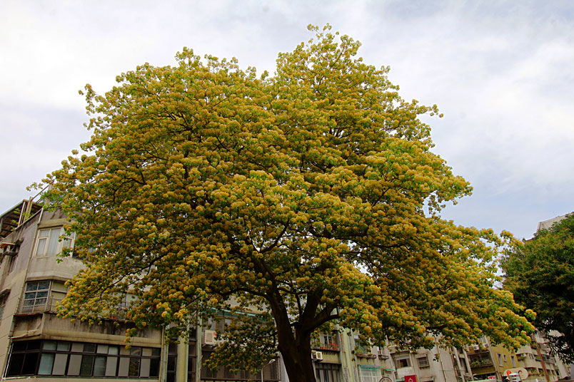 10公尺高的大樹藏於都市巷弄中,春天的大雨過後,一夜間花朵轟