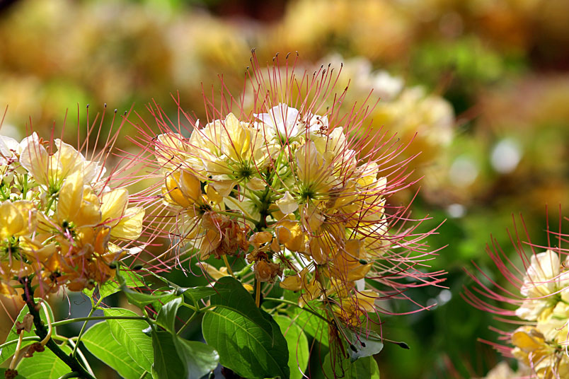 兩性花,頂生繖房花序,有長柄;花絲淡紫色,細長且多;花大