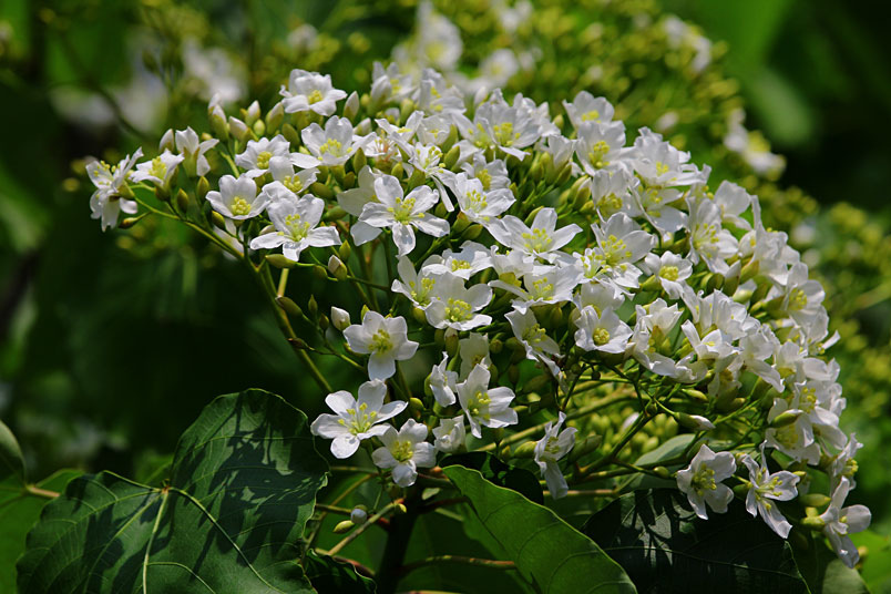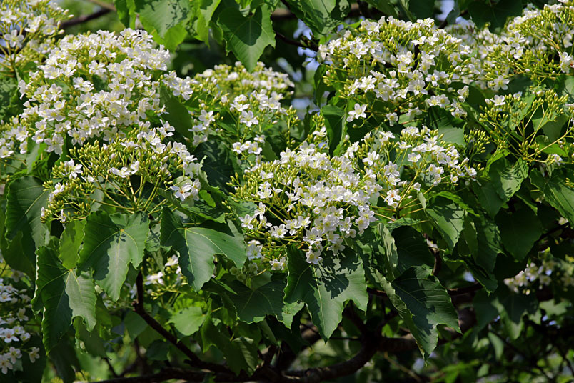 三年桐單性花,雌雄同株,花是黃色或白色的,較千年桐大,葉子常