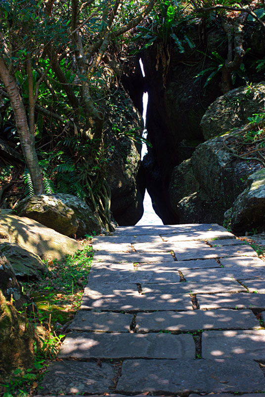 。園內步道依地勢而築,引領穿越巨岩夾峙的一線天,在崎嶇礁