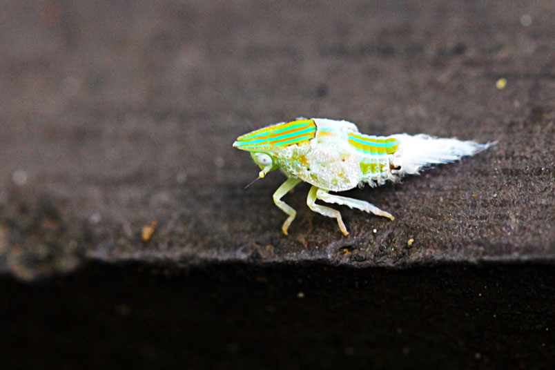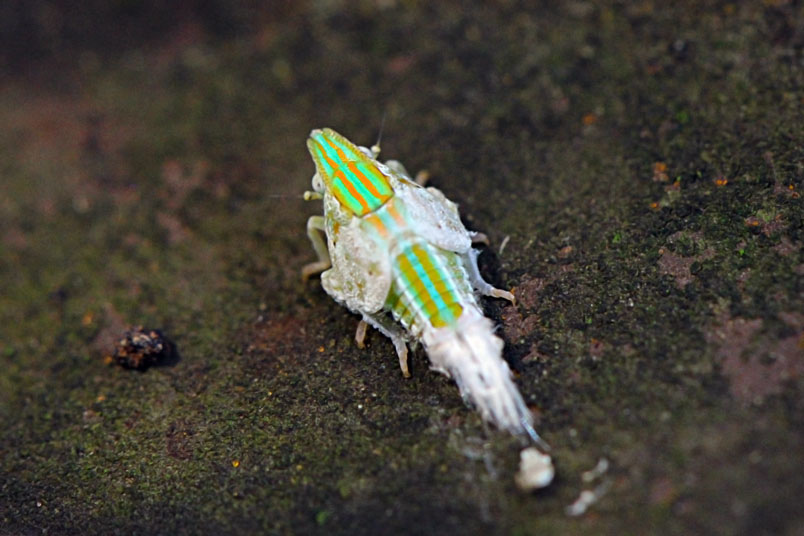 葉蟬若蟲,體色鵝黃色,胸背板及腹背基部具褐色斑。腹背紅褐