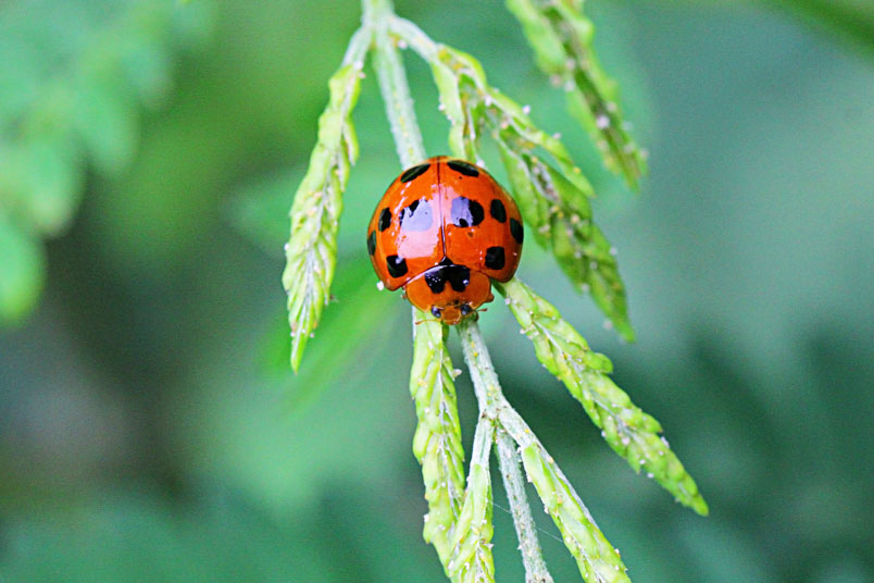 前胸背板棗紅色具5枚黑色的斑點,雄蟲兩側斑點相連,翅鞘為鮮