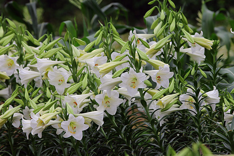 鐵砲百合株高約40~70公分,葉互生,狹披針形。花頂生,下傾呈