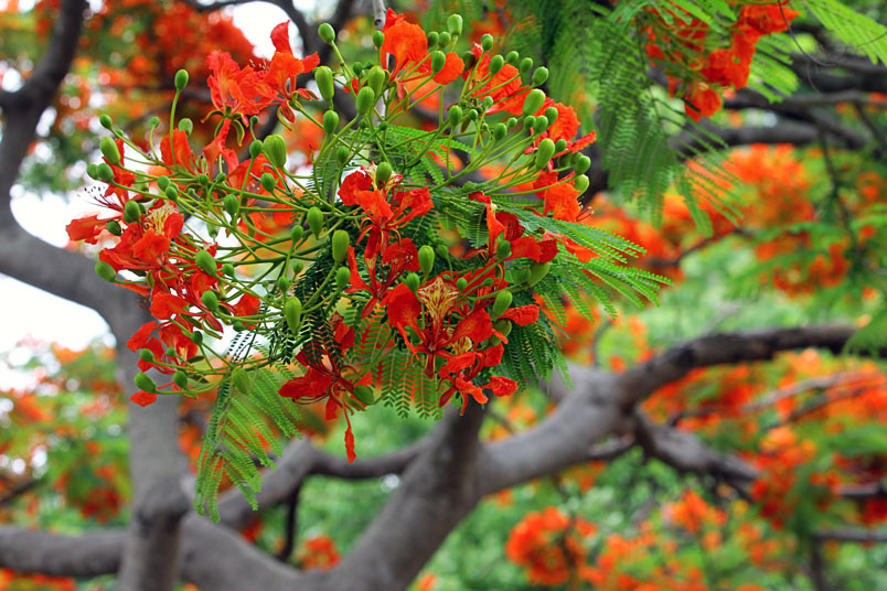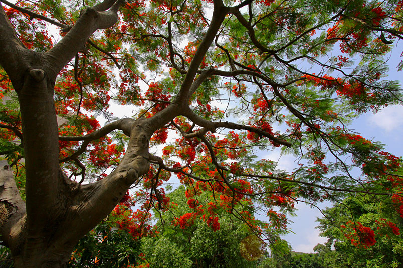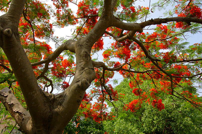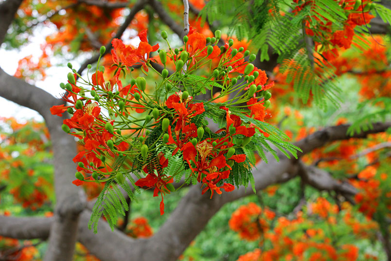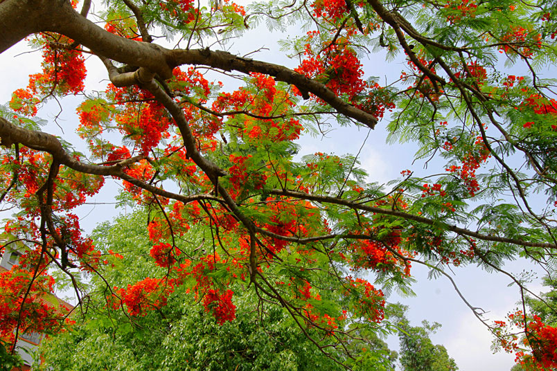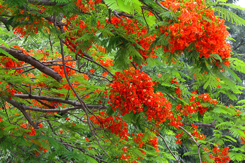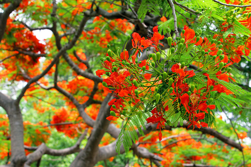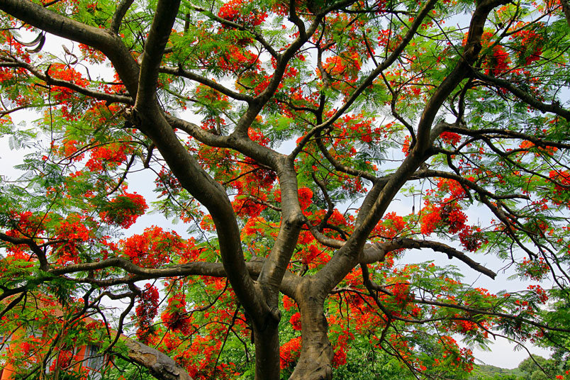 鳳凰木原產於馬達加斯加,枝條常橫向伸展如鳳凰展翅般,故名鳳
