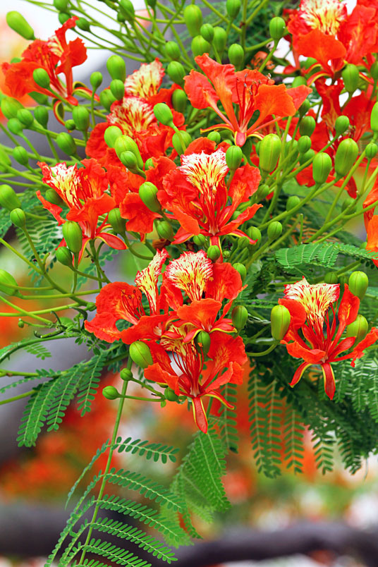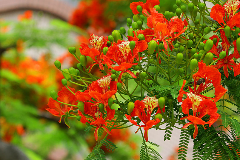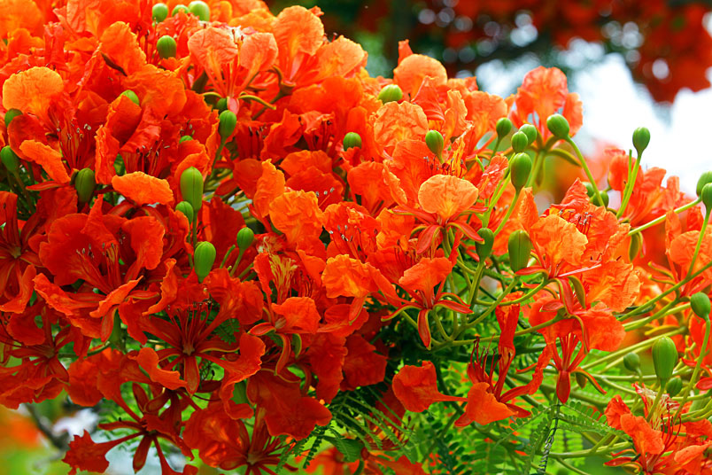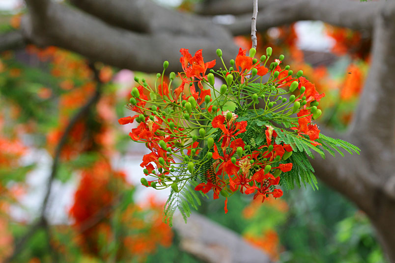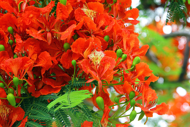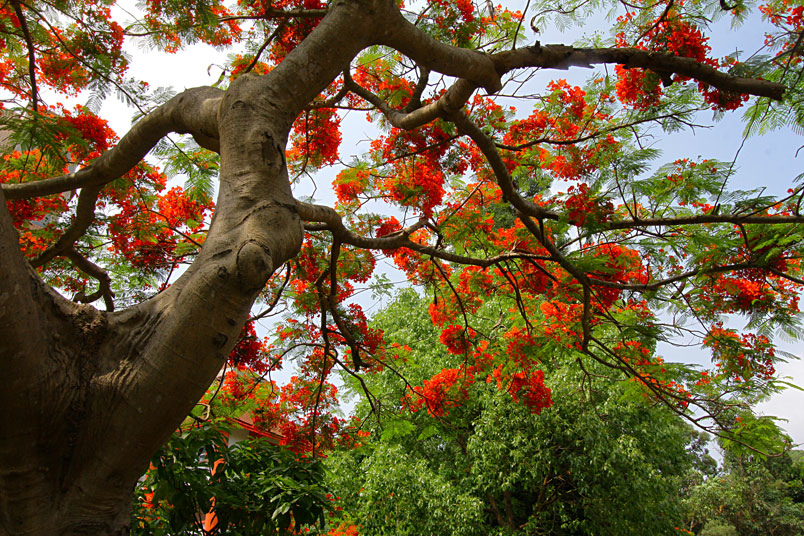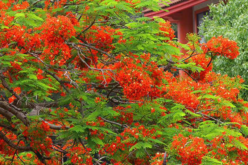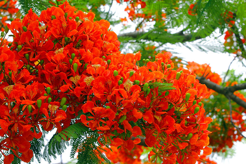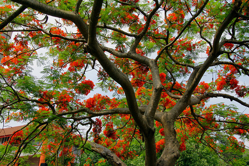 鳳凰木原產於馬達加斯加,枝條常橫向伸展如鳳凰展翅般,故名鳳