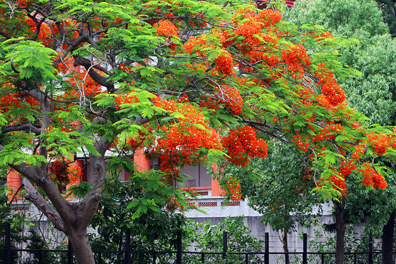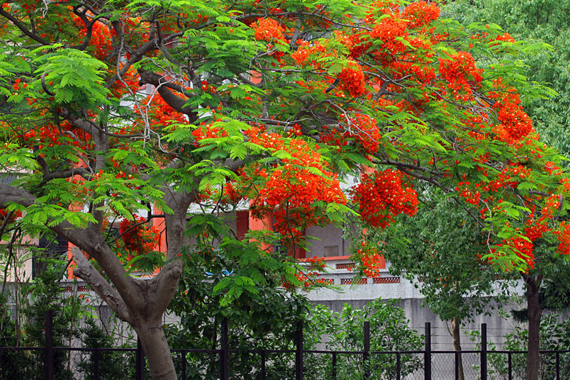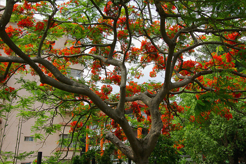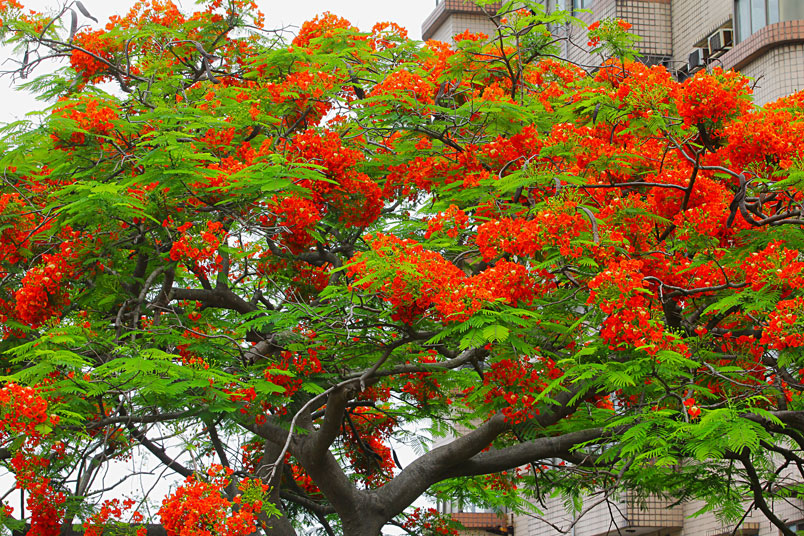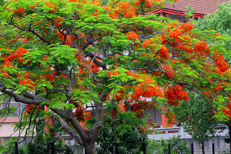 凰木。鳳凰木在臺灣中南部普遍種植,夏天紅花滿樹綻放時,更是