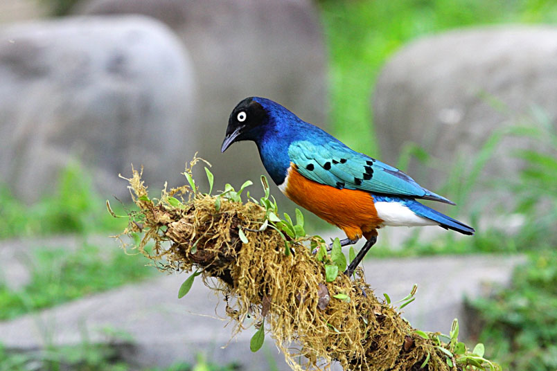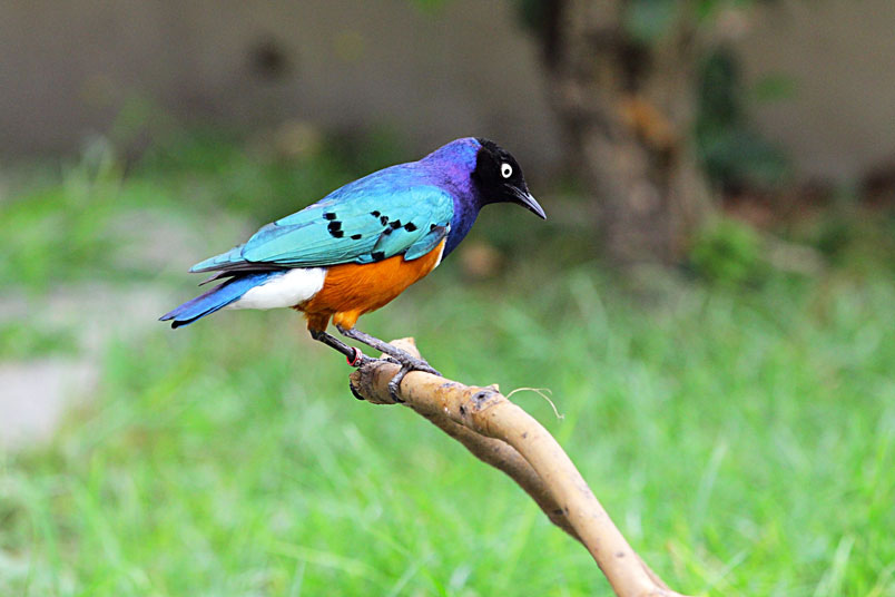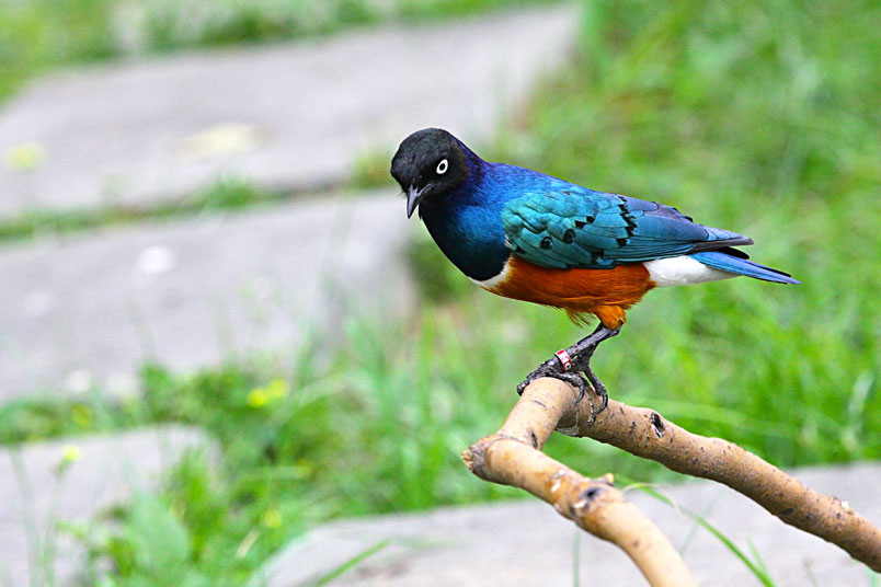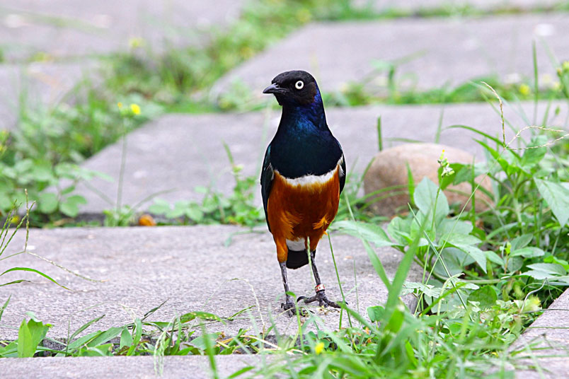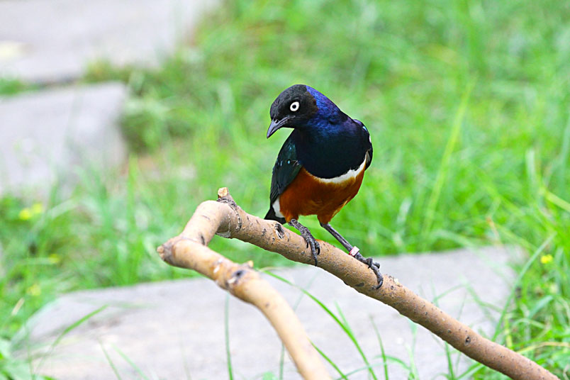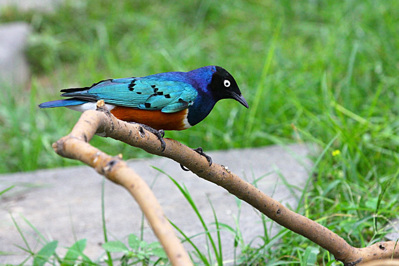 栗頭麗椋鳥,長約18cm,頭黑色,胸、背及翅膀為藍色及藍綠色的混