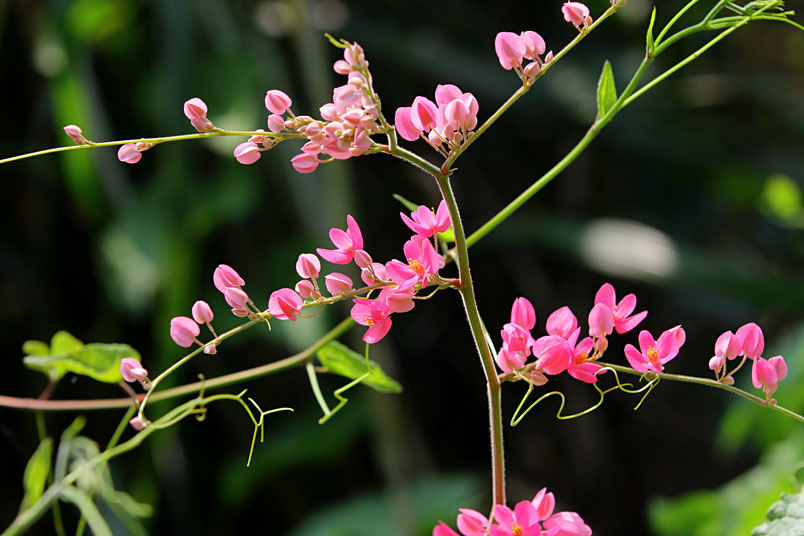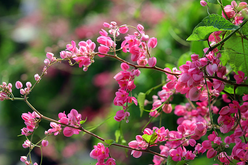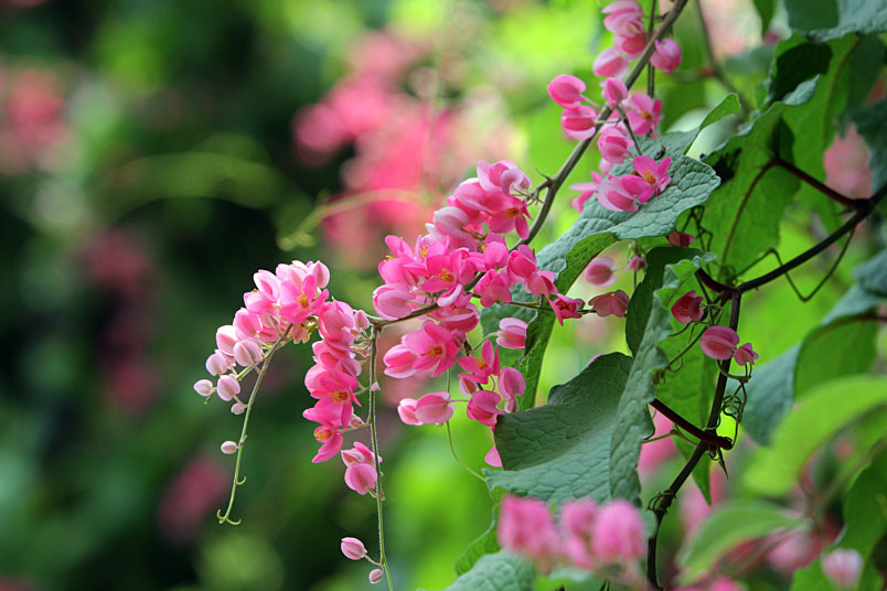 蜷捲的枝藤,串起一串串粉紅的珊瑚,也串起一串串碧綠的心葉!