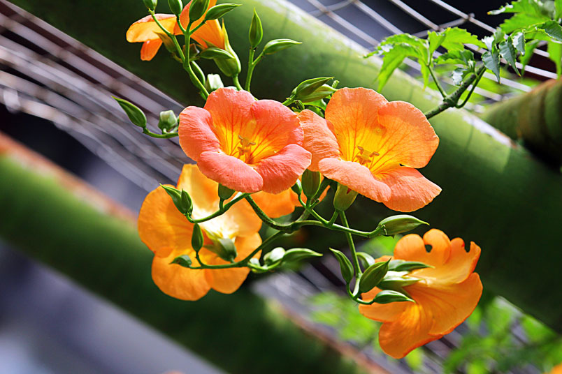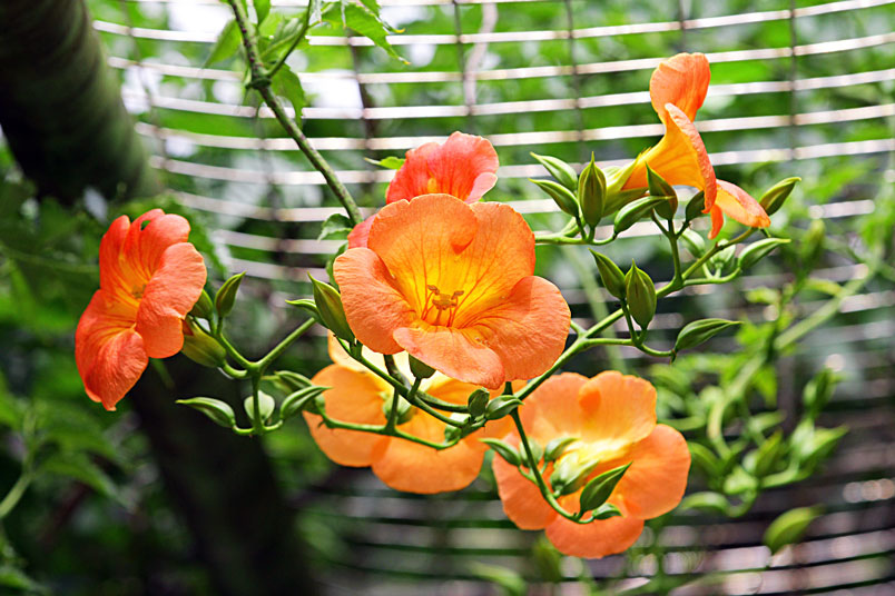 凌霄花攀緣灌木,才能藉著氣根攀木凌空,加上盛花期常見十數
