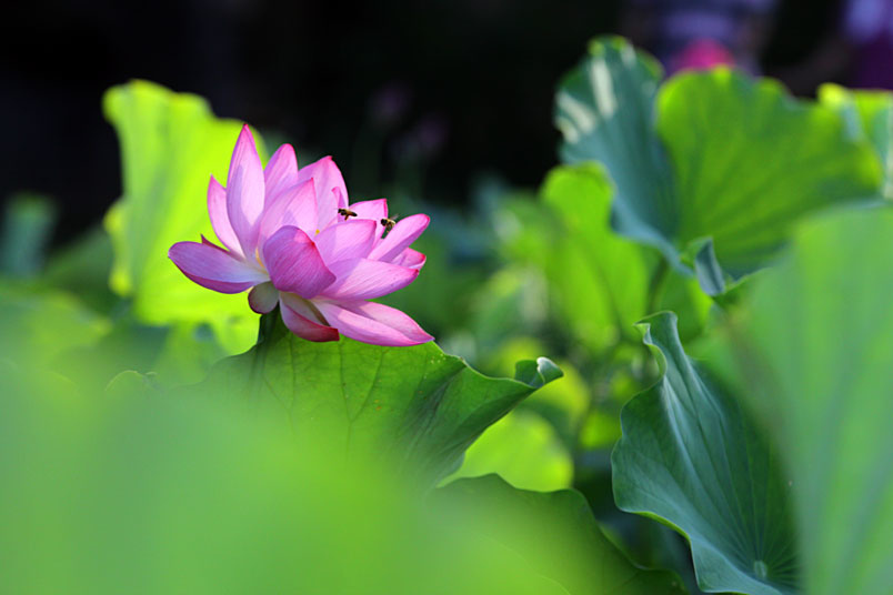 幾隻蜜蜂在荷池上空飛旋,千姿百態,美不可言。