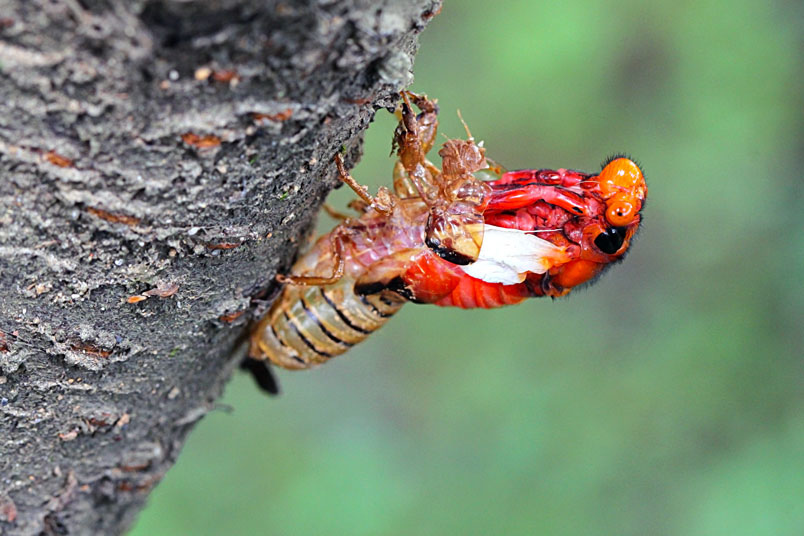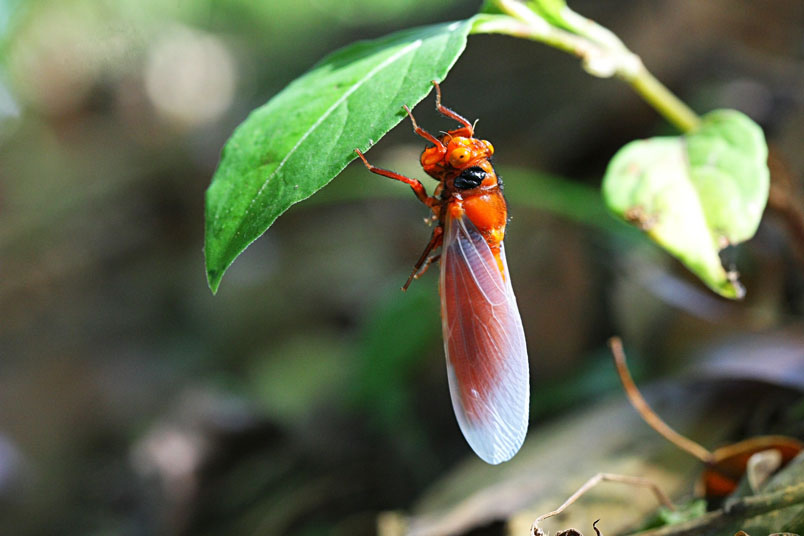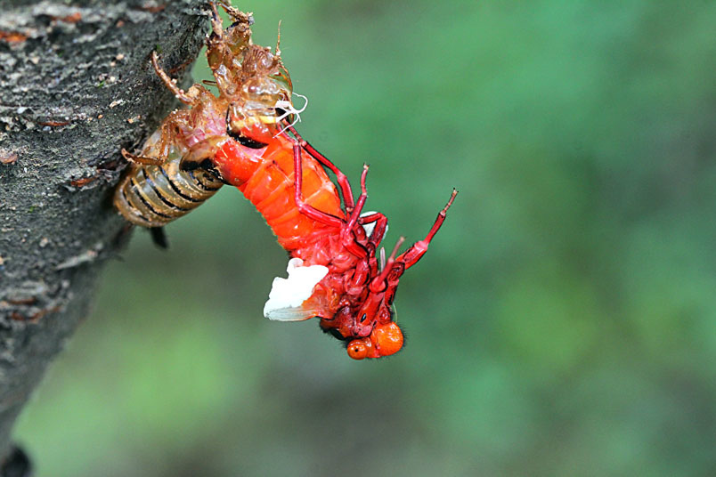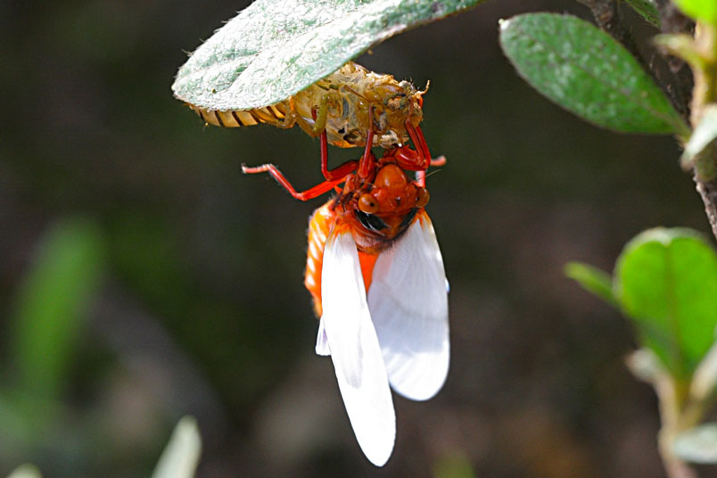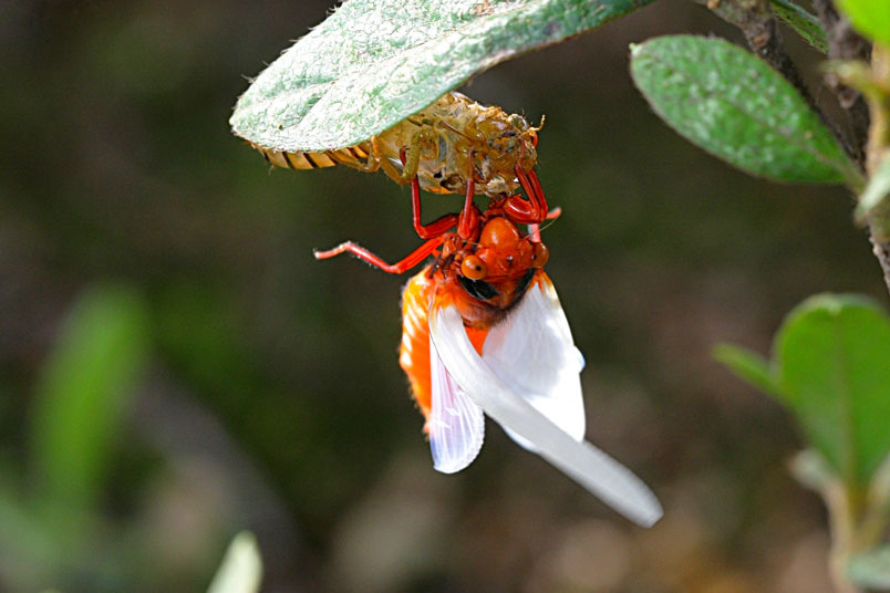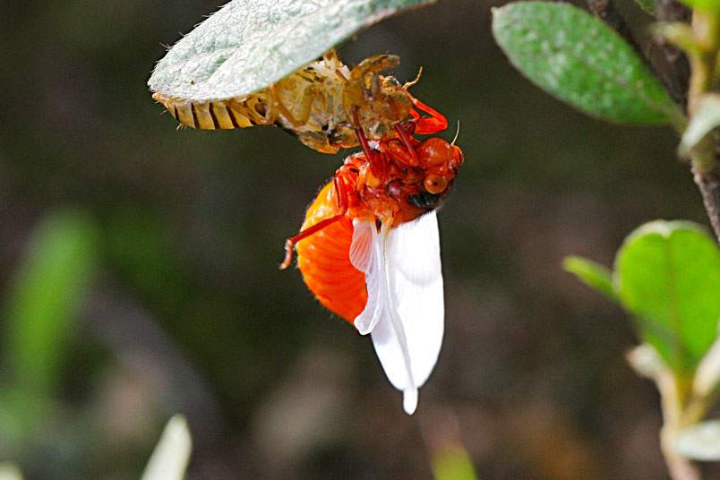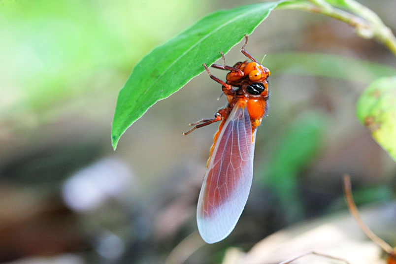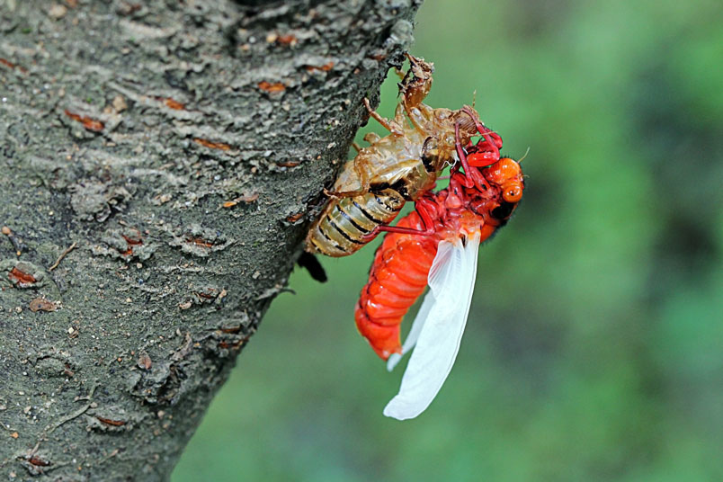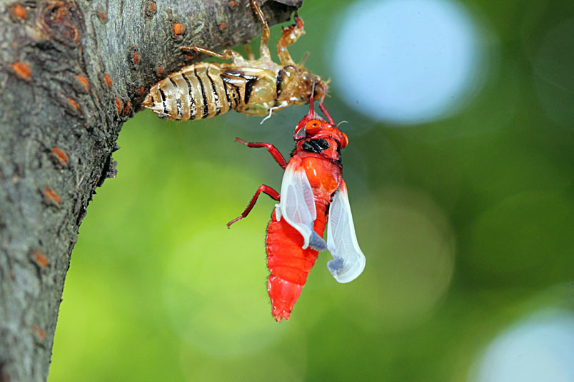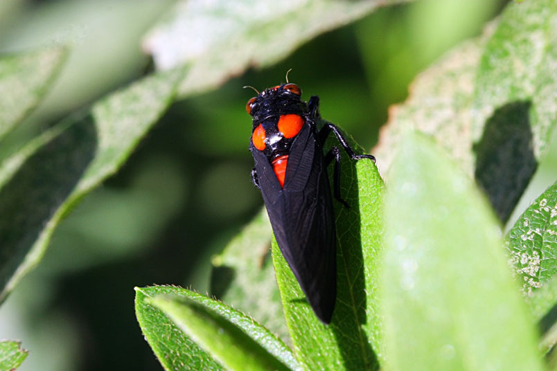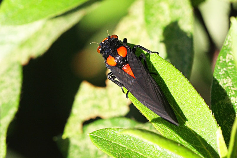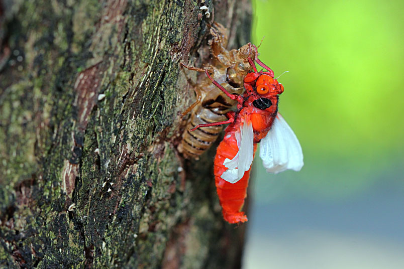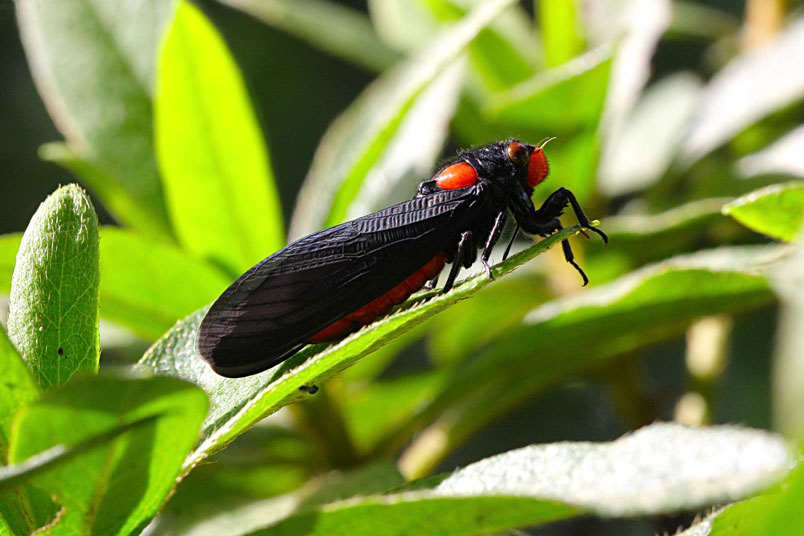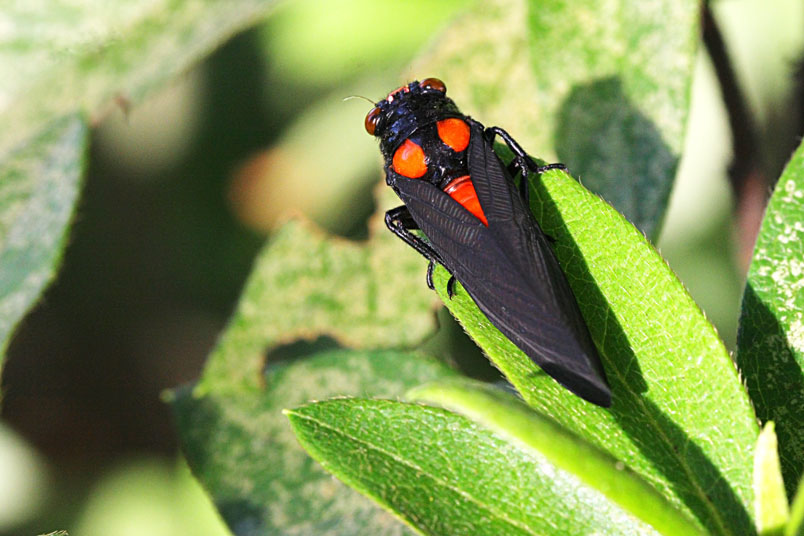 黑翅蟬的艷紅和黑,具有警告掠食者「牠們具有毒素和難吃的特