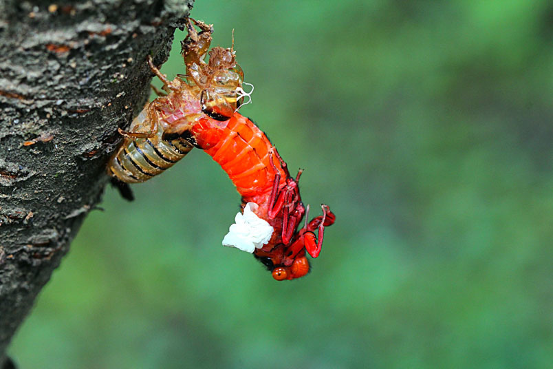 首先若蟲從土裡鑽出來,爬上樹幹緊抓住樹枝或樹葉,一動也不