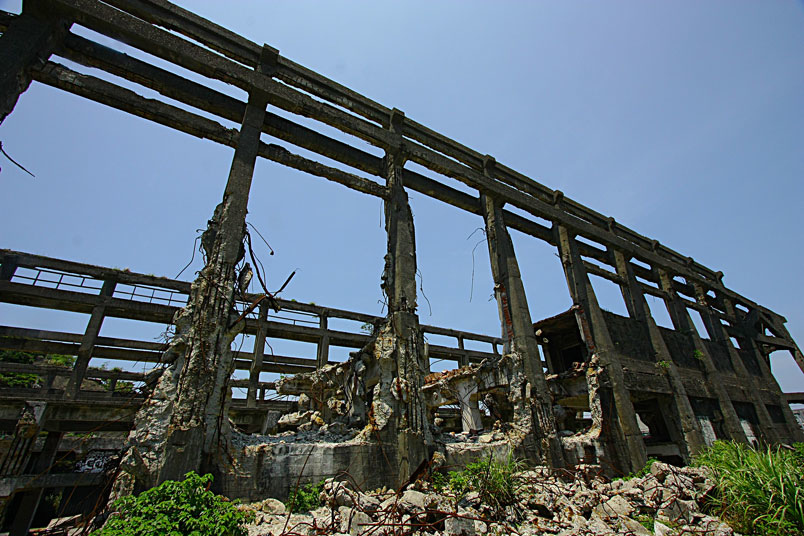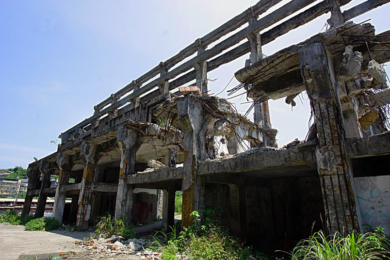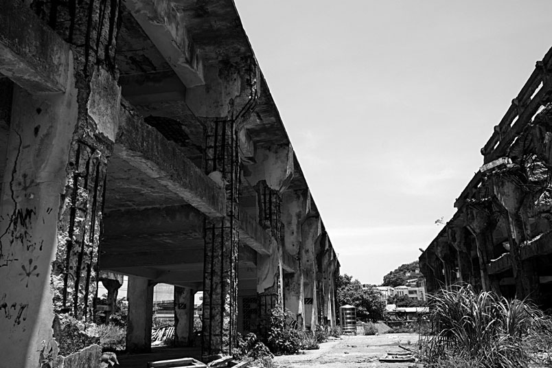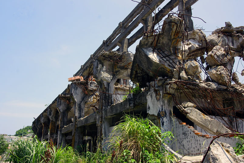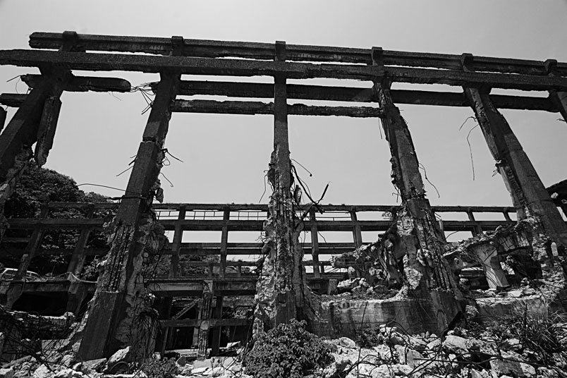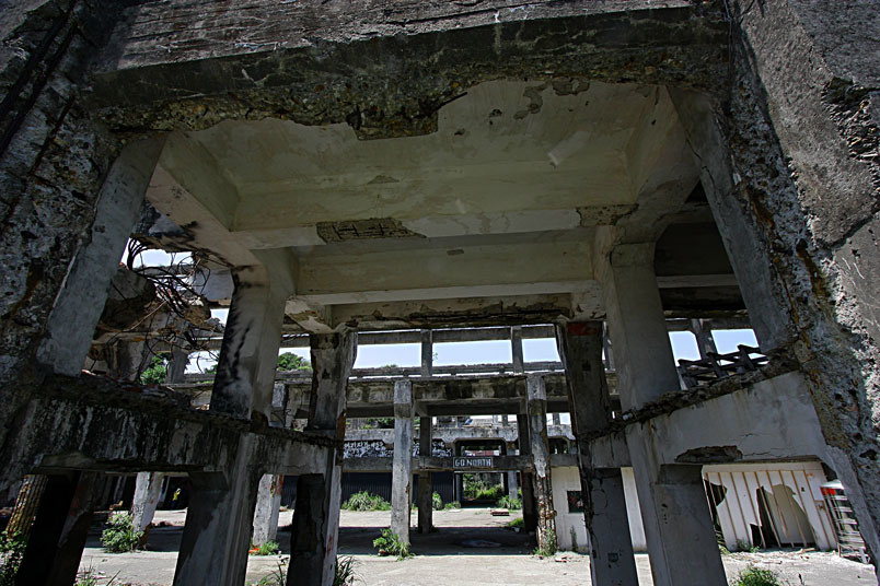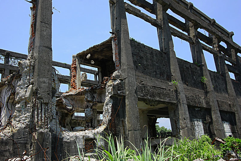 廢墟之中水泥崩壞、鋼筋裸露,置身其中有一股頹廢、殘破的氛圍。