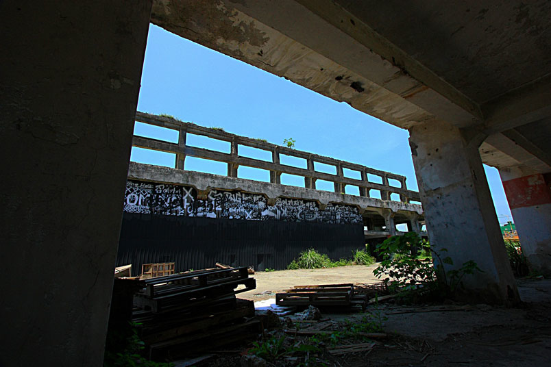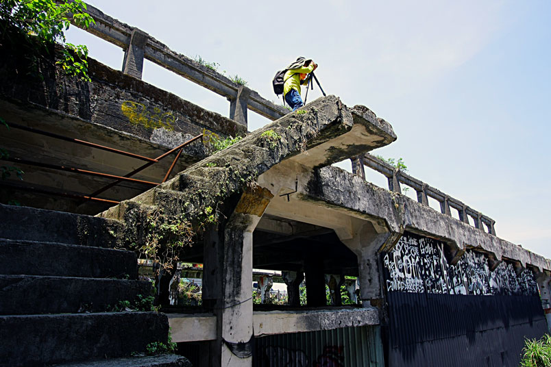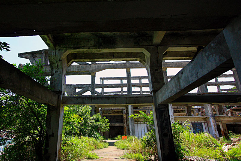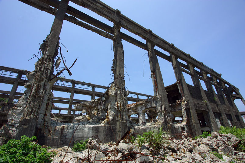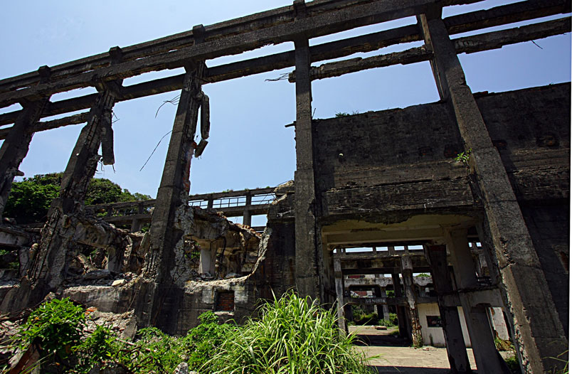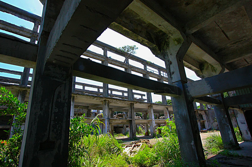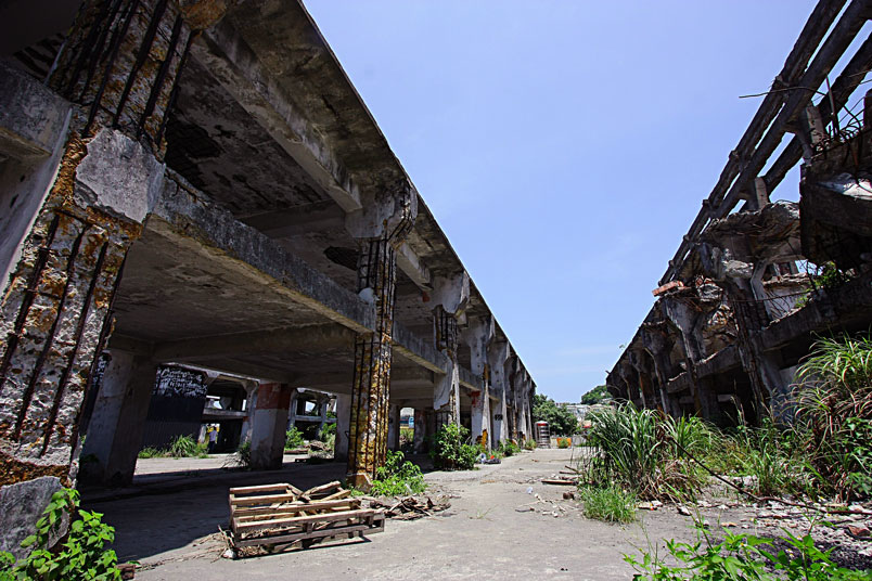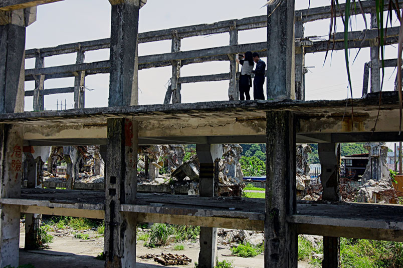 廢墟之中水泥崩壞、鋼筋裸露,置身其中有一股頹廢、殘破的氛圍。