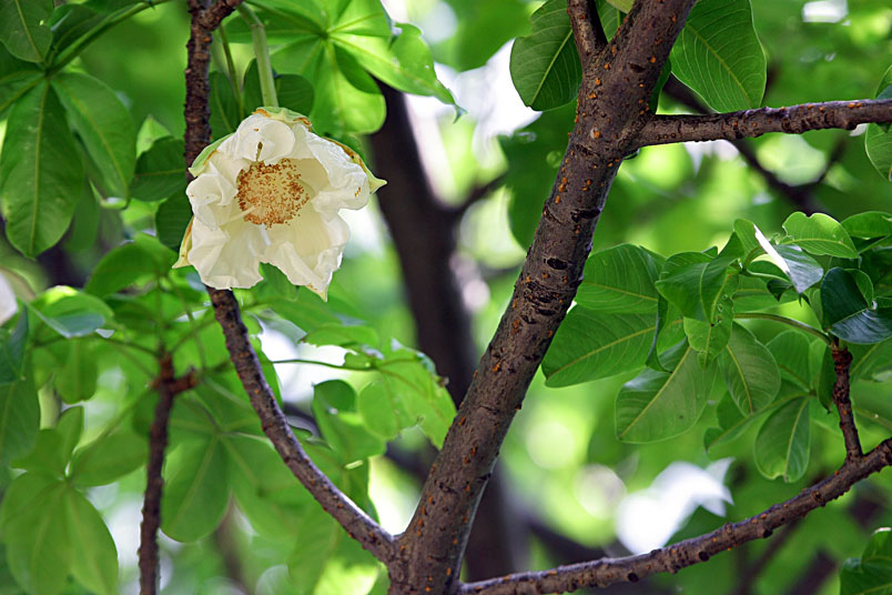 猢猻樹在五至八月間,天色漸暗的傍晚,會開出倒吊大型白花。下