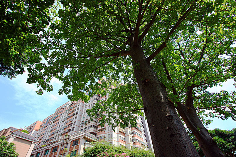 樣矮胖,樹身呈直幹型,樹幹分枝也較密,樹冠也比較完整茂密。