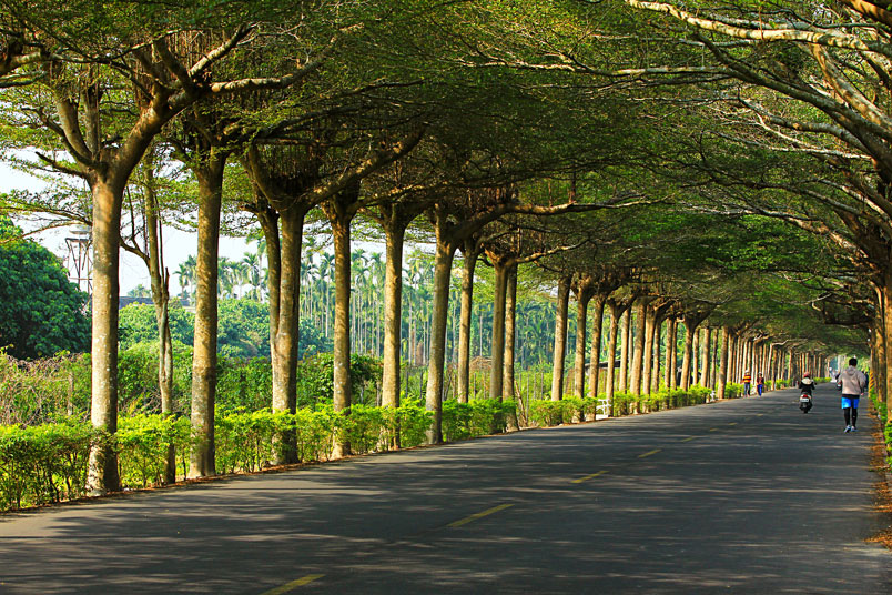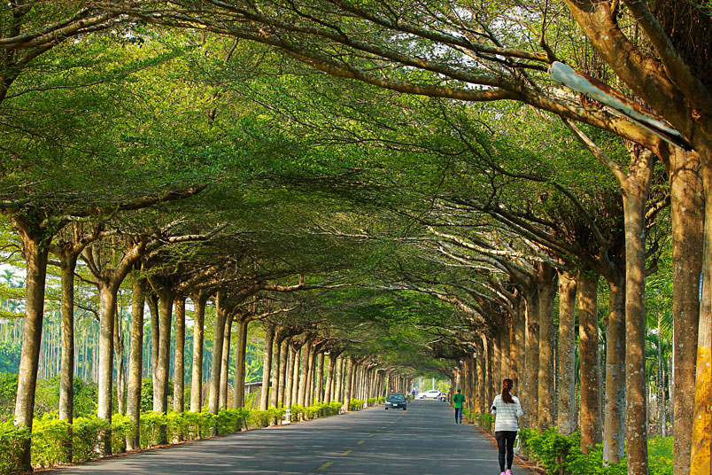 道正好只有雙向二車道,因此兩邊生長的小葉欖仁恰好可以合擁,