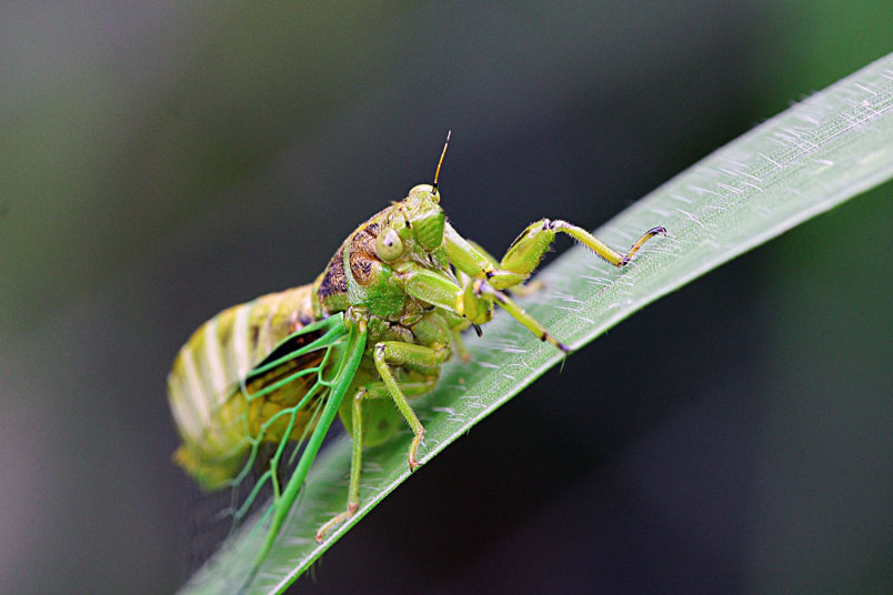 草蟬鳴叫時會拱著腹部,上下擺動著,會叫的是雄蟬,因為雄蟬要