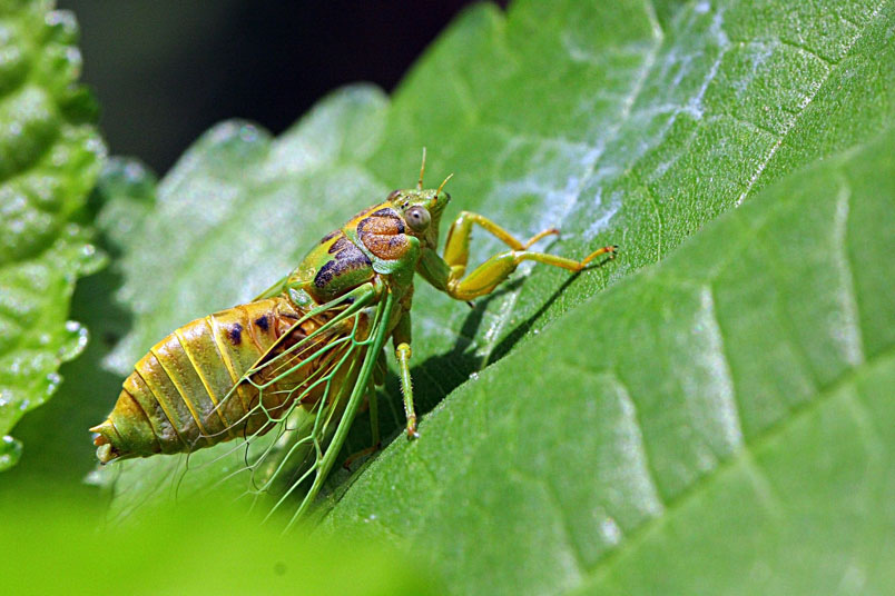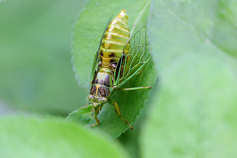 前胸背板呈暗褐色,中間顏色呈淡綠色,腹部黃綠色,腹端有4個