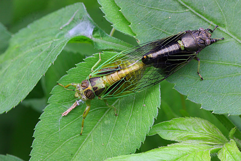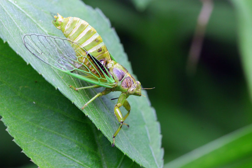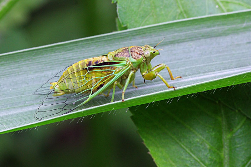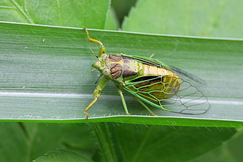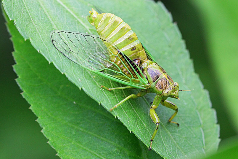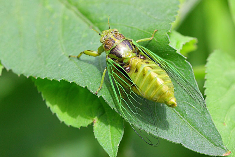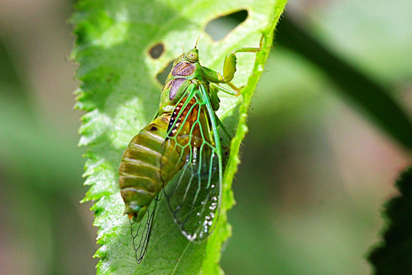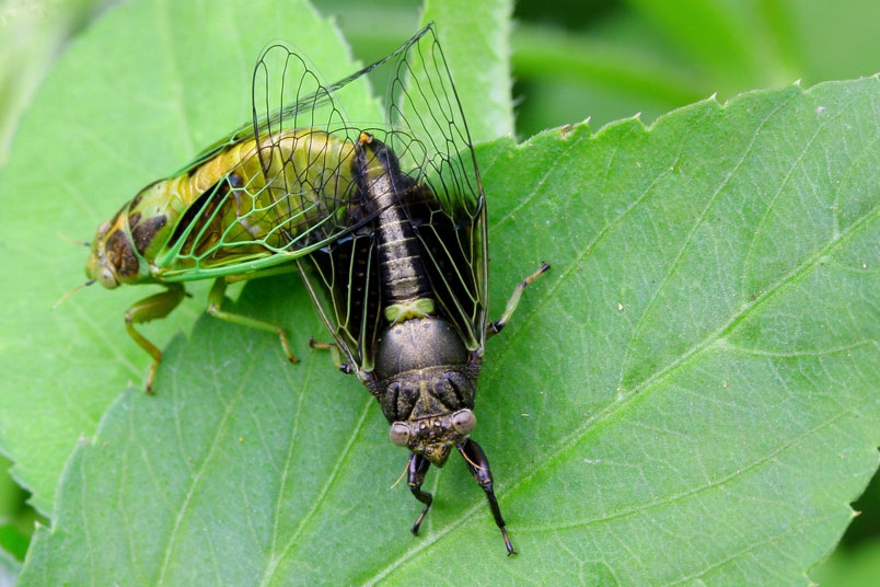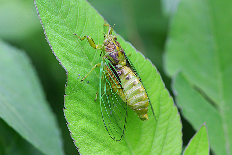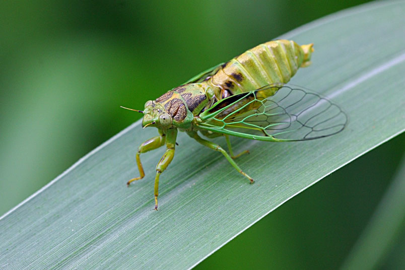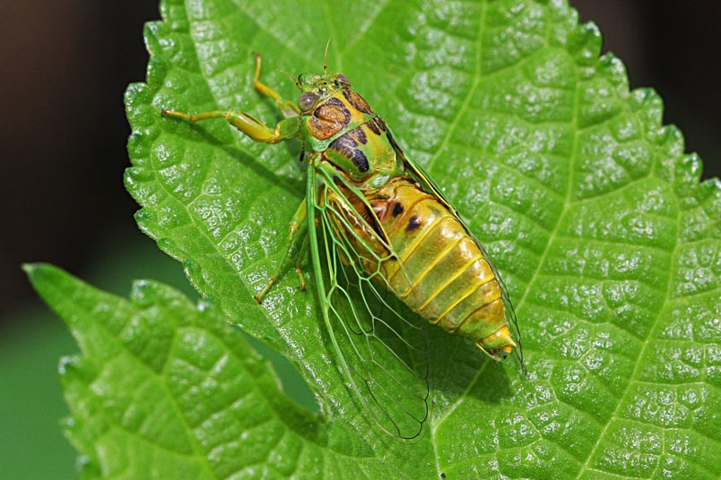 雌蟬約10~15mm。體色多變,有綠色、黑色、黃褐色,綠褐色等,