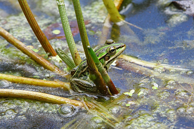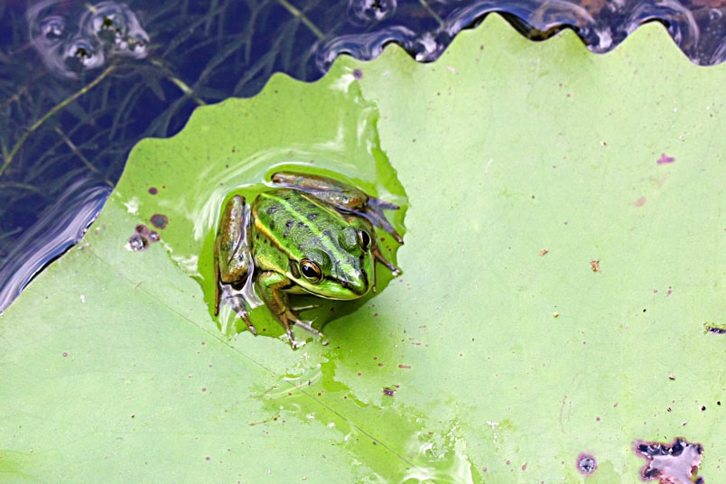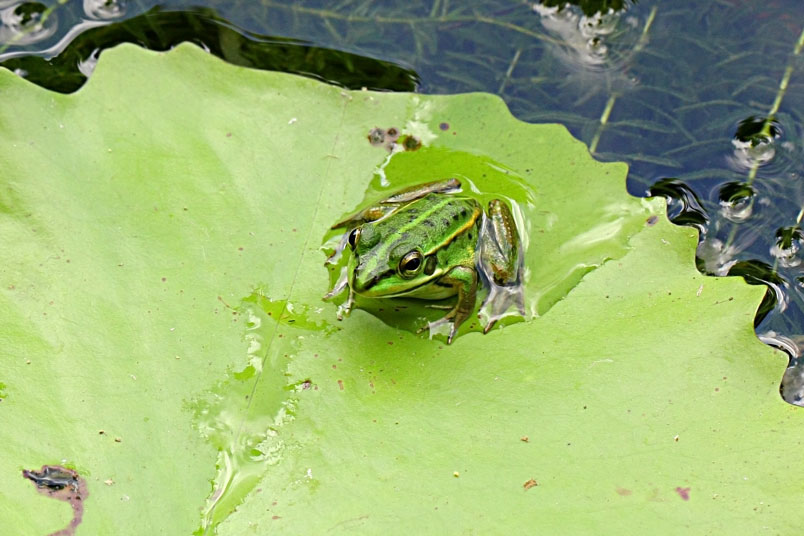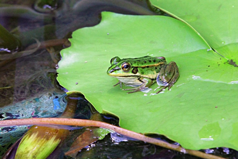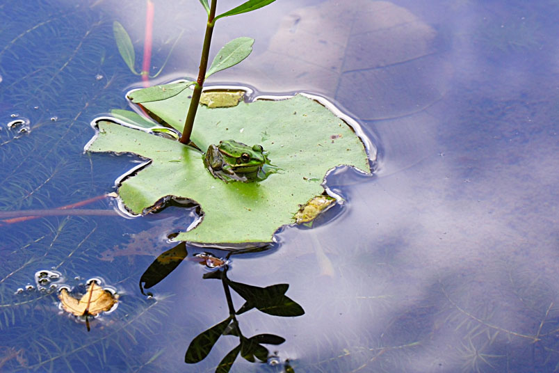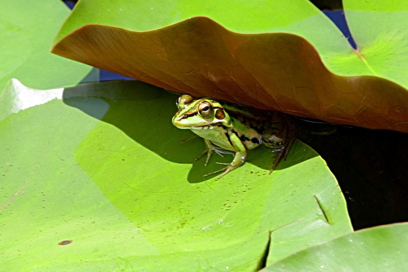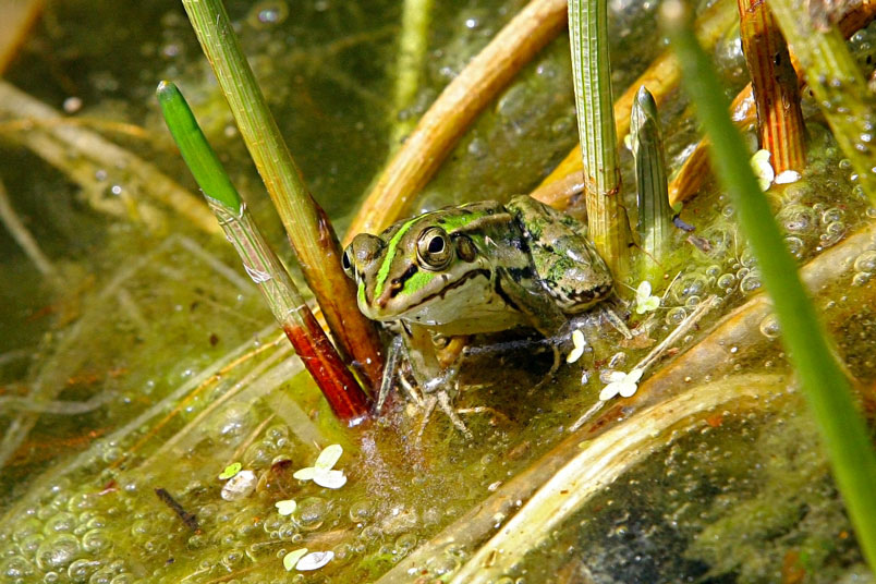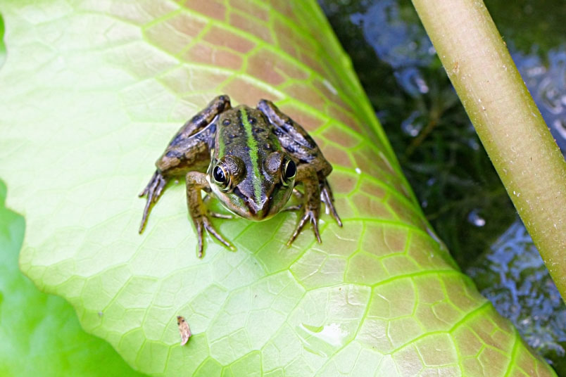 金線蛙生性隱密機警,常常僅露出頭來觀察四周的動靜,若受到干