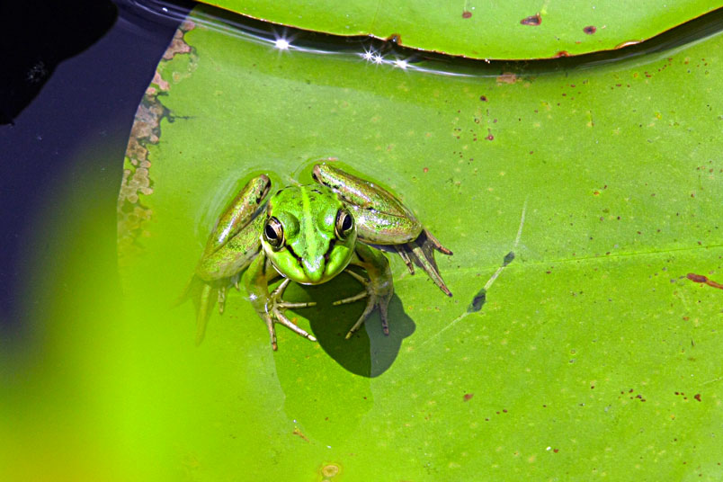 金線蛙英文俗名是Green pond frog,由此可知牠們是綠色的、喜歡