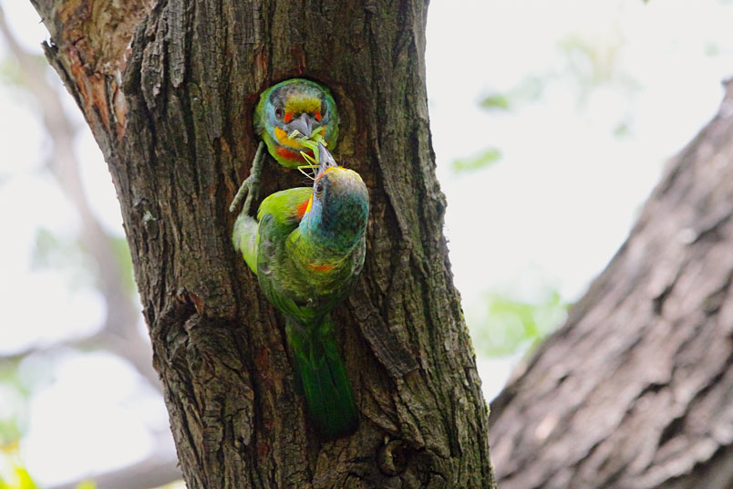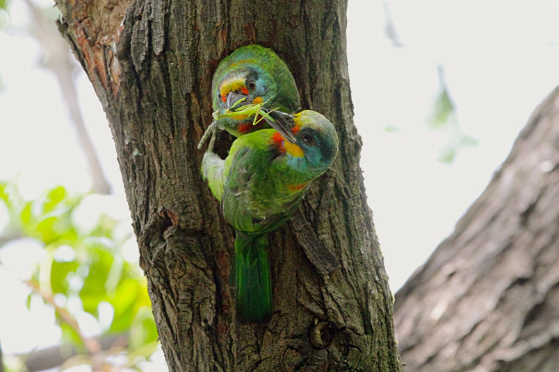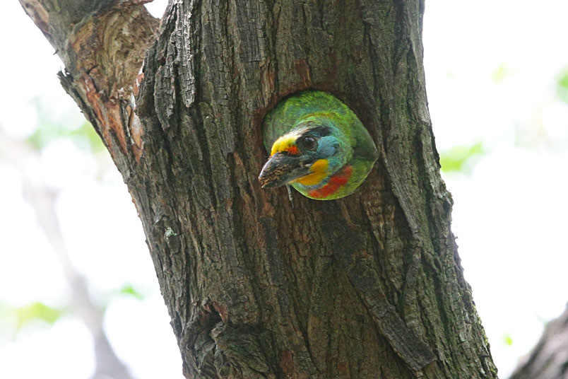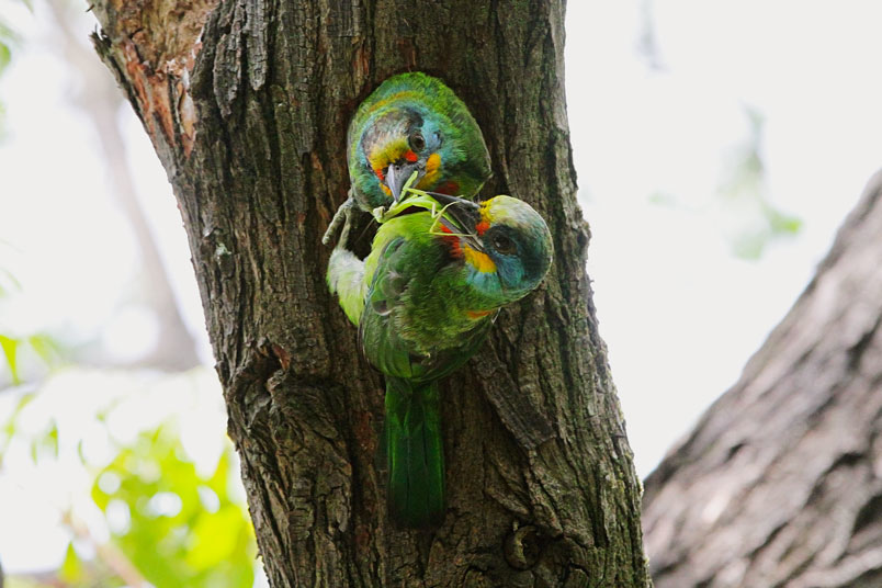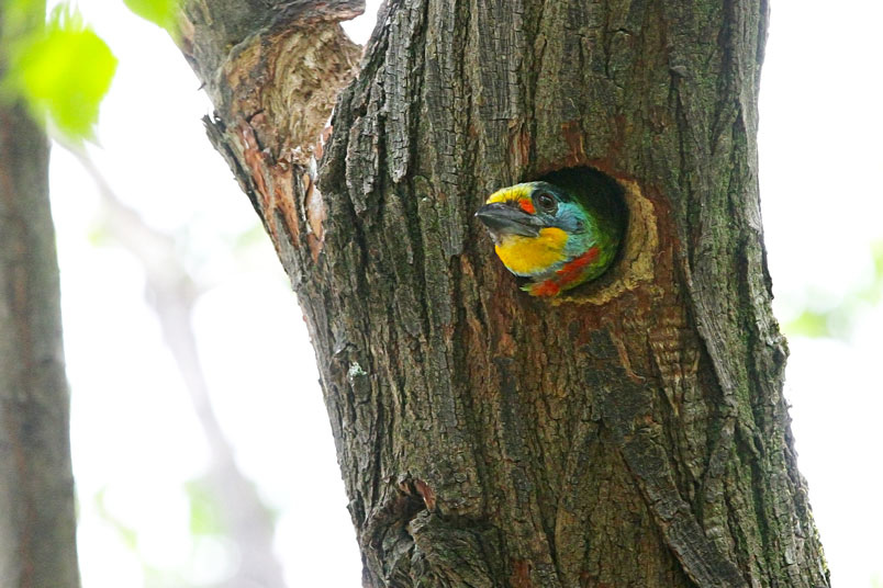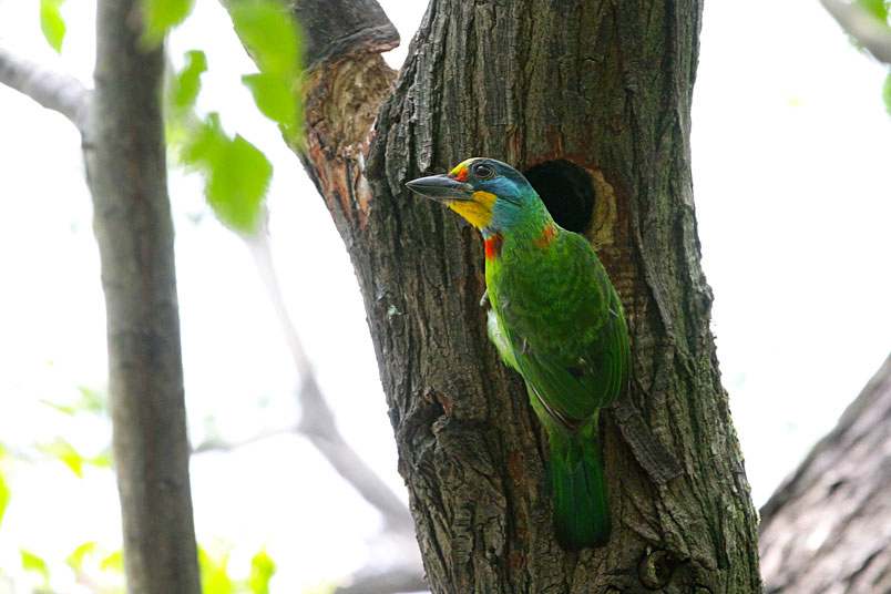 五色鳥顧名思義共有五種羽色:嘴及眼後呈黑色,額與喉為黃色,