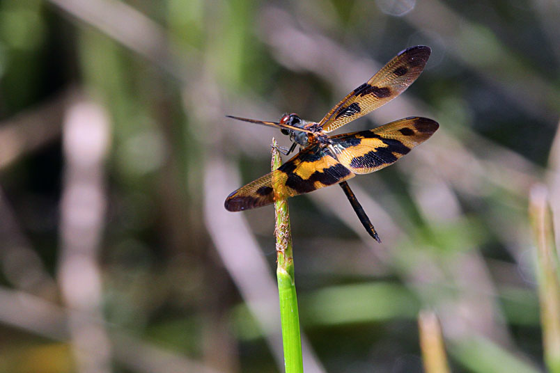 彩裳蜻蜓,翅膀呈現黃色,有著許多不規則排列的斑紋,而腹部呈