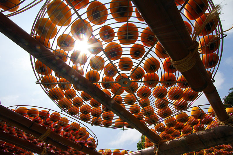 置滿於棚架上的柿子,正享受著日光浴,宛如金色小球一般,透過