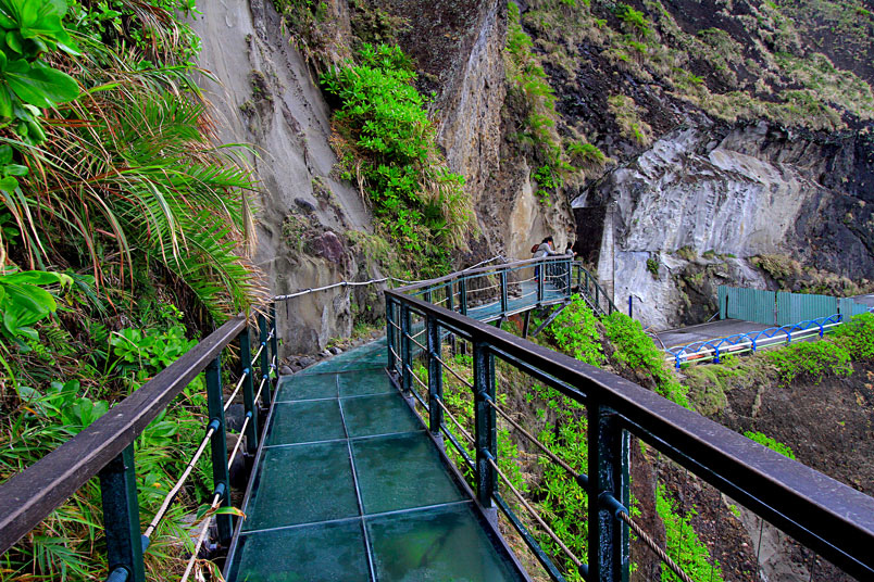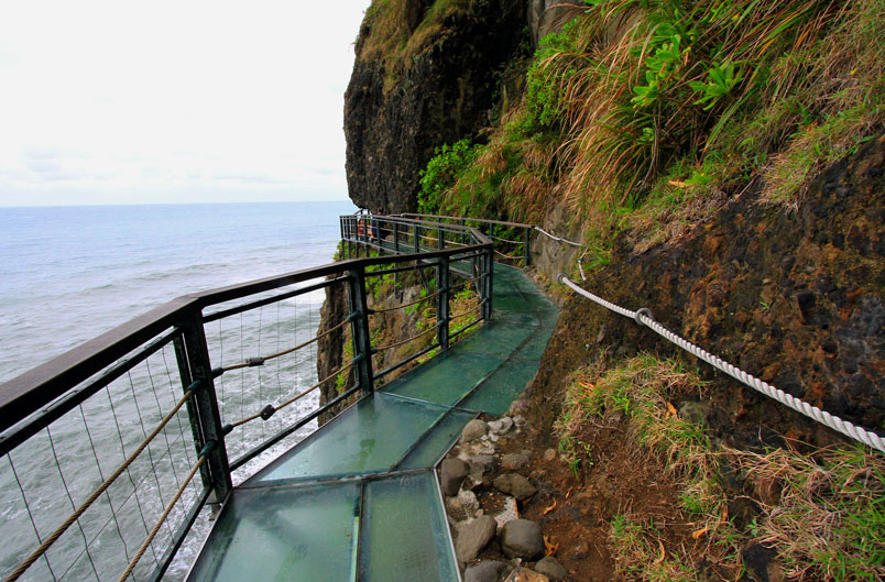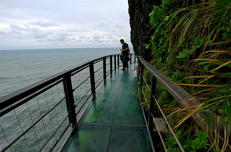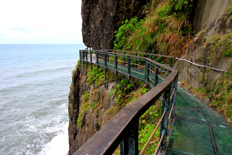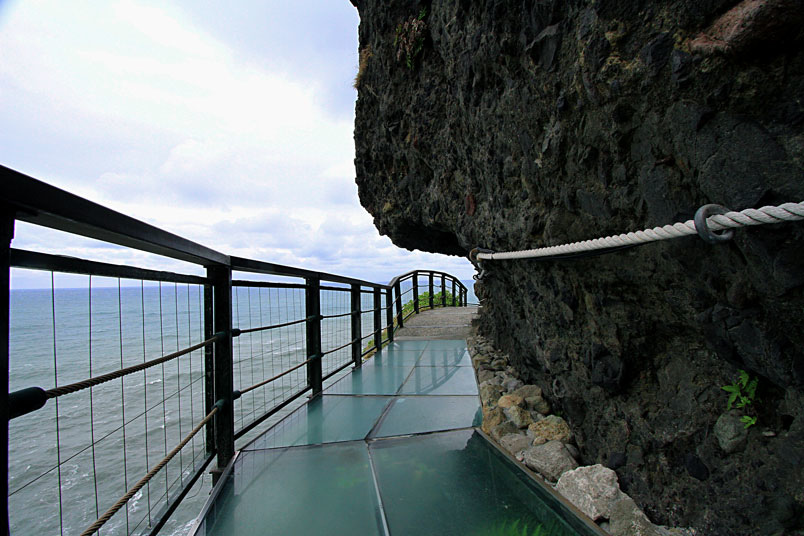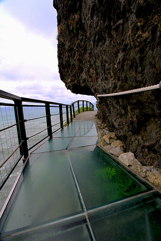 用鋼骨與強化玻璃打造透明的玻璃棧道,距離海面約50公尺,可讓