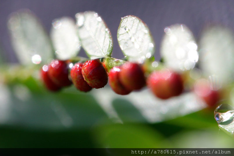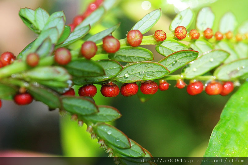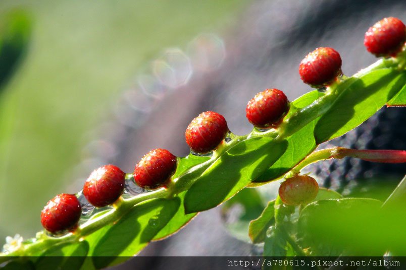 果實為扁球形的蒴果,就像是珠子般一顆顆整齊的貼在葉背附近的