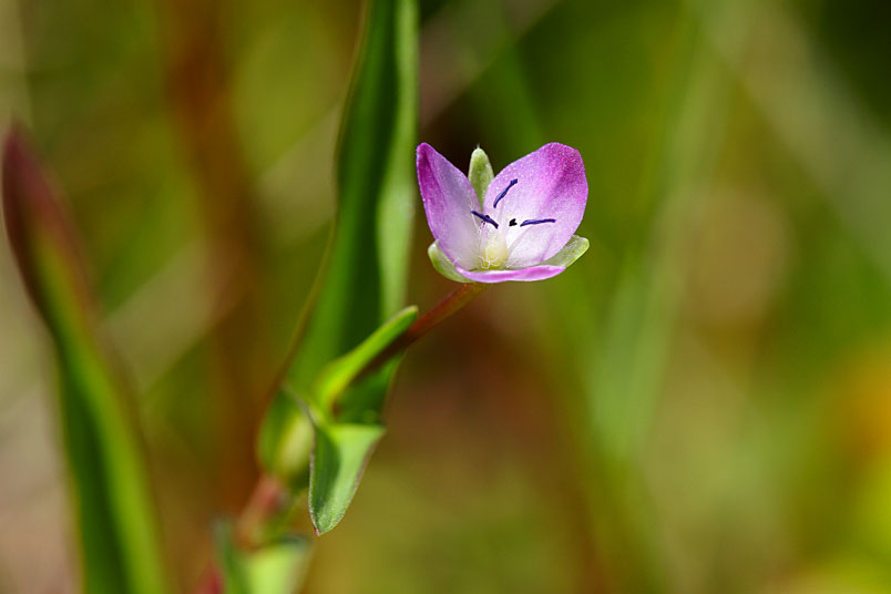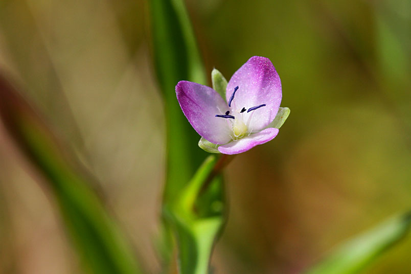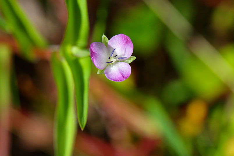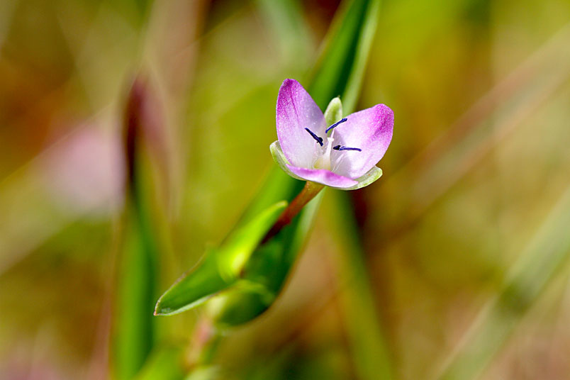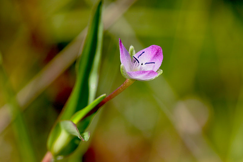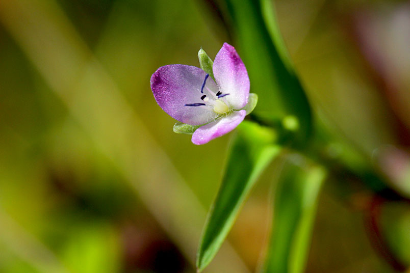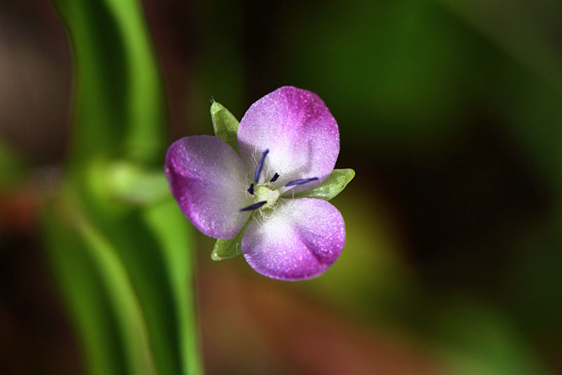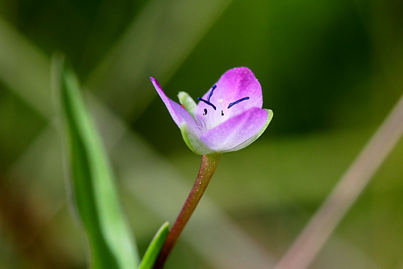花常單生(稀2或3),腋生,紫紅色至粉紅色,雄蕊6枚,3藍3紫;