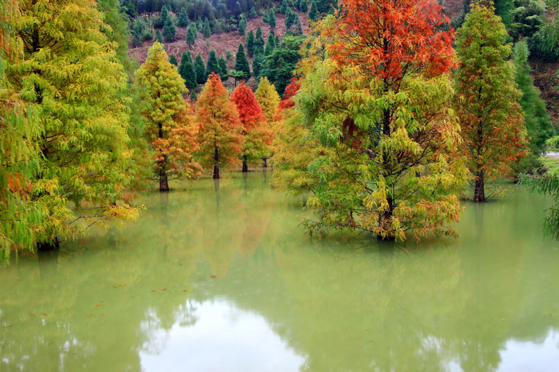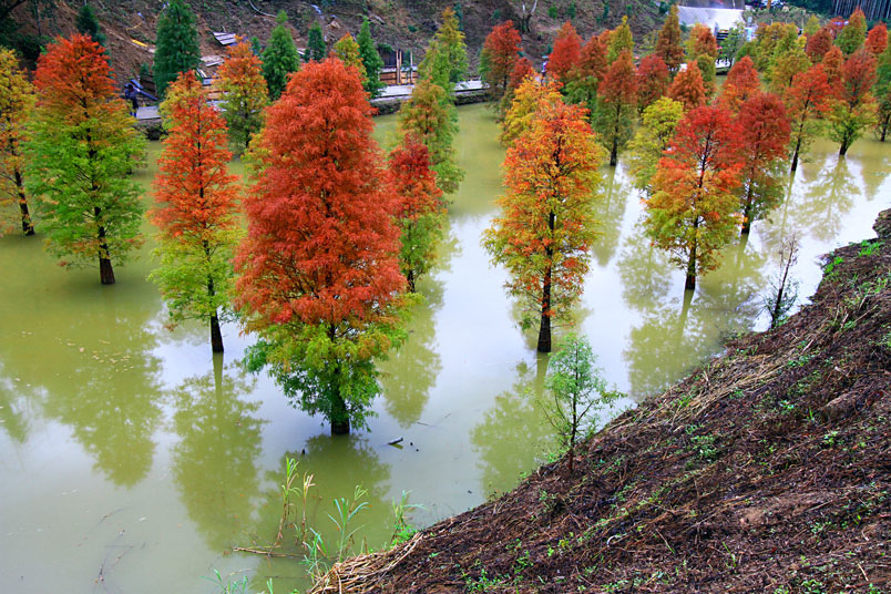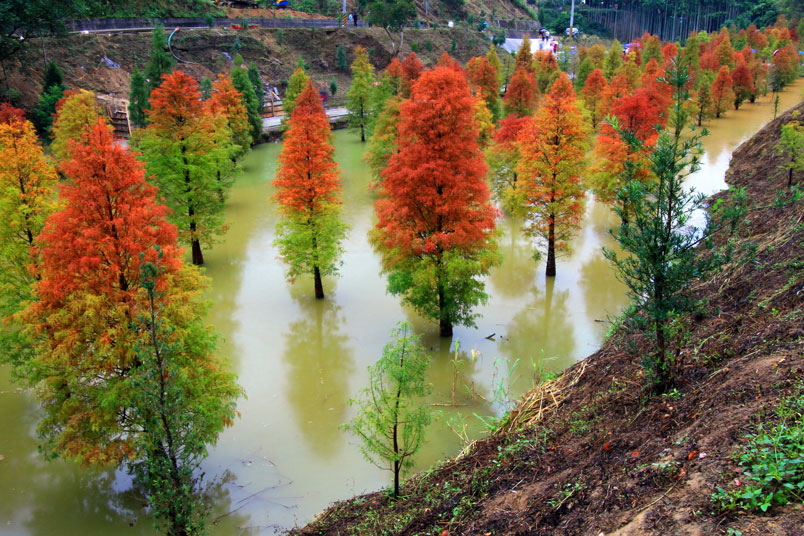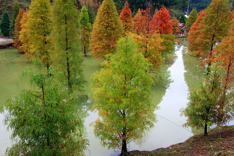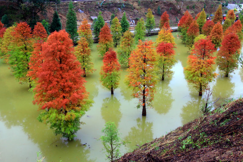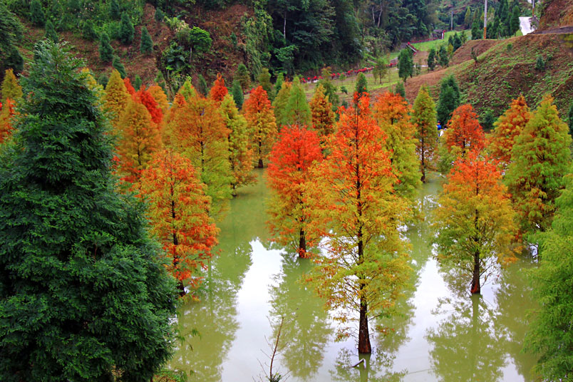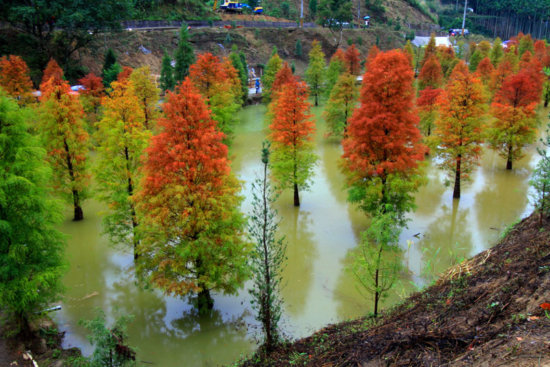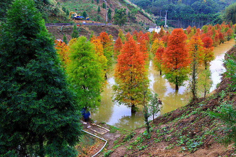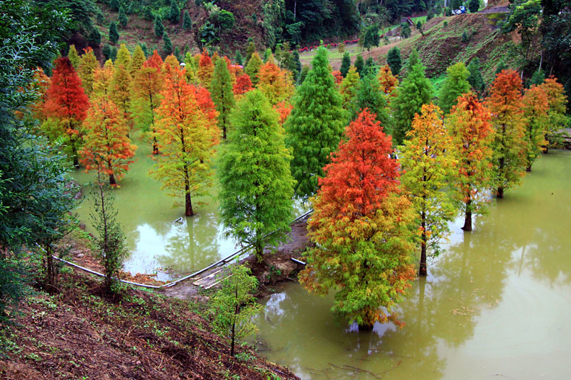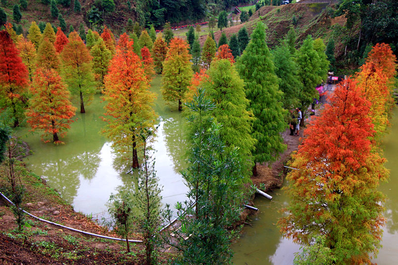 落羽松林紅、黃、綠色參雜,色彩繽紛,讓每位慕名而來的遊客